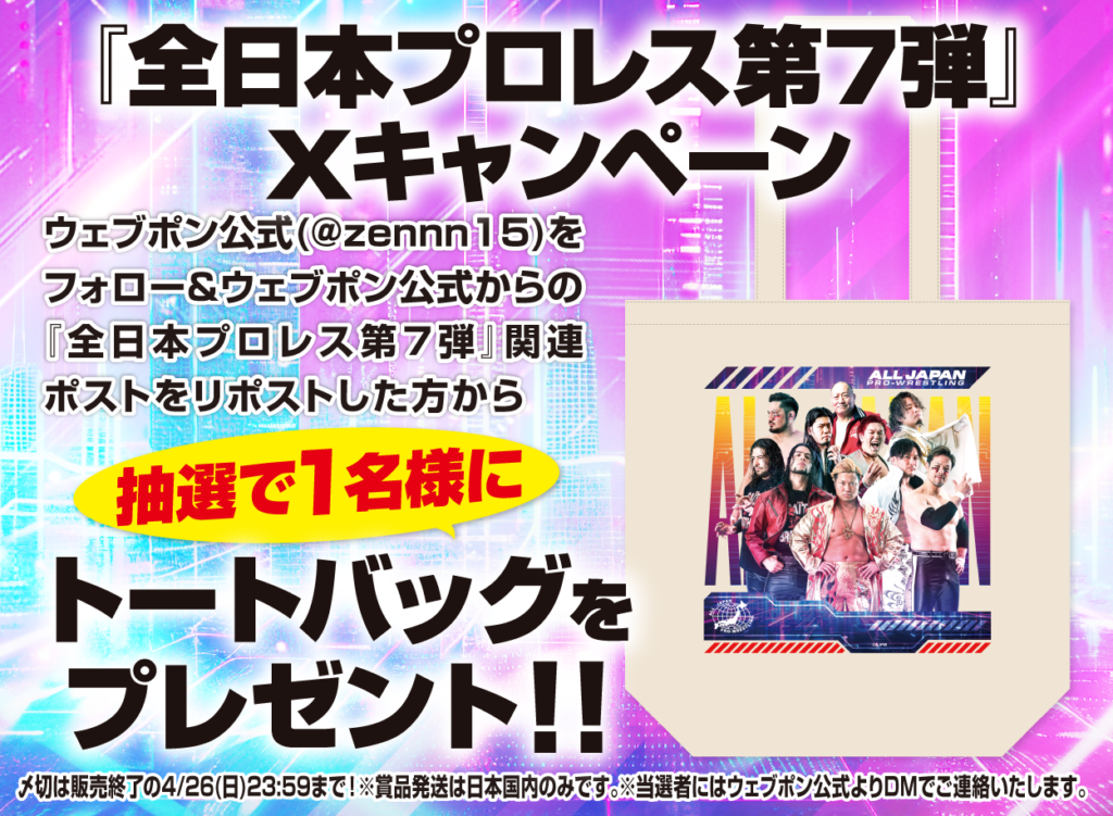 ウェブポン公式(@zennn15)をフォロー&ウェブポン公式からの『全日本プロレス第7弾』関連ポストをリポストした方から抽選で1名様に【トートバッグ】をプレゼント!!〆切は販売終了の4/26(日)23:59まで!