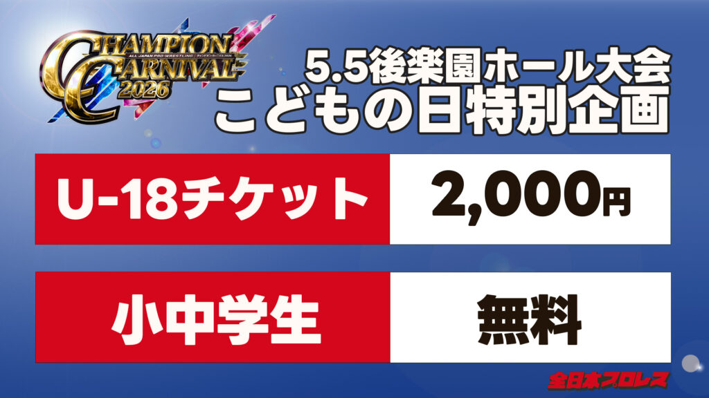 【こどもの日特別企画】「チャンピオン・カーニバル2026」5月5日(火・祝)後楽園大会にて「U-18チケット」「小中学生チケット」販売のお知らせ