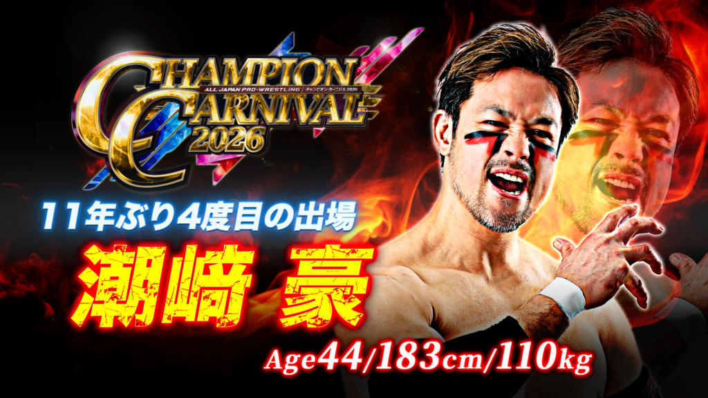 今年は全16選手がエントリー!4月12日(日)後楽園大会から開幕の「チャンピオン・カーニバル2026」の全出場者が決定しました。潮﨑豪が11年ぶりに「チャンピオン・カーニバル」出場決定!さらに、DRAGONGATE・我蛇髑髏の菊田円の2年連続出場が決定!