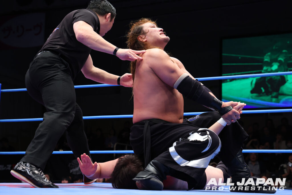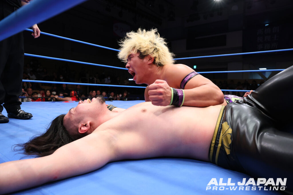 全日本プロレスのロゴがプリントされたTシャツを着た小藤将太は、新たなテーマ曲『One big heart』で入場。対戦相手の2AW・真霜拳號とは、昨年11月の広島大会でもシングルマッチで対戦。その時は真霜が腕固めで勝利している。2度目の一騎打ちでリベンジに燃える小藤は、ヘッドシザース、ドロップキックで先手。真霜もすぐさま脇固めで逆襲。左腕へのピンポイント攻撃で痛めつけていく。小藤が前転からのドロップキックで悪い流れを断ち切りブーメラン・クロスボディ、ミサイルキック。さらに卍固めで絡みつく。エルボー合戦を繰り広げると、トリッキーな丸め込み。フィッシャーマンズ・スープレックスは決められず、真霜が脇固めで切って取る。流れるように腕ひしぎ逆十字固め、腕固めに移行して勝負あり。広島大会を再現するかのように貫禄の勝利を収めた。