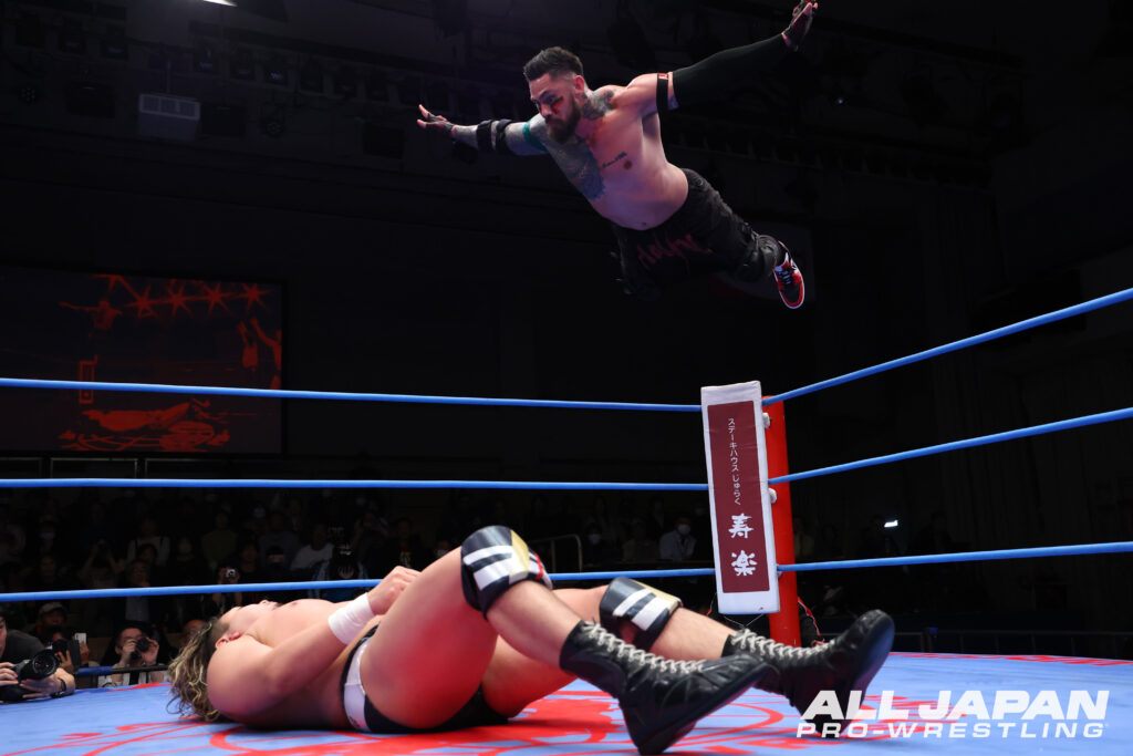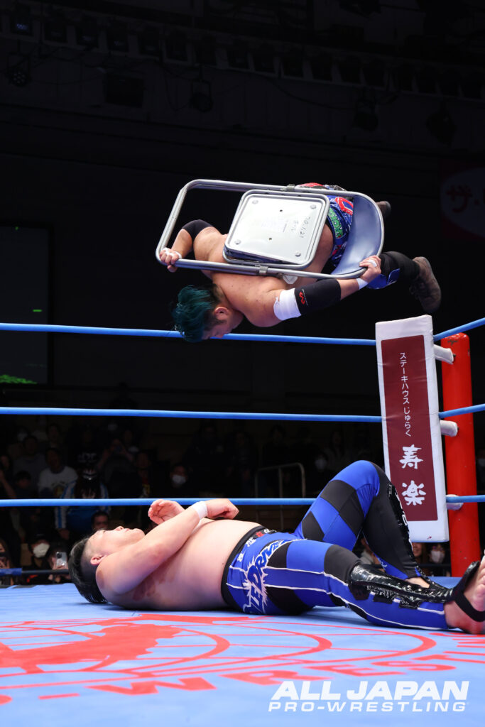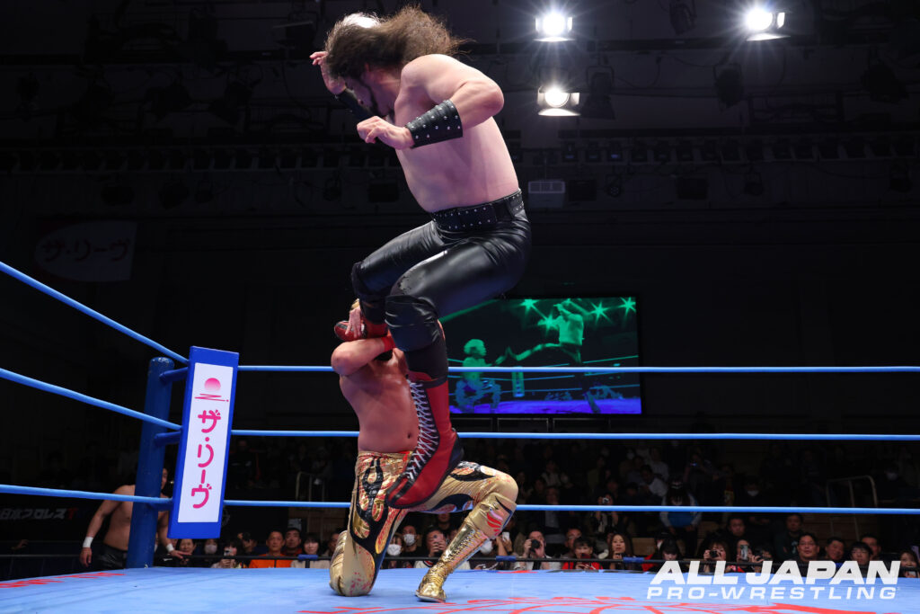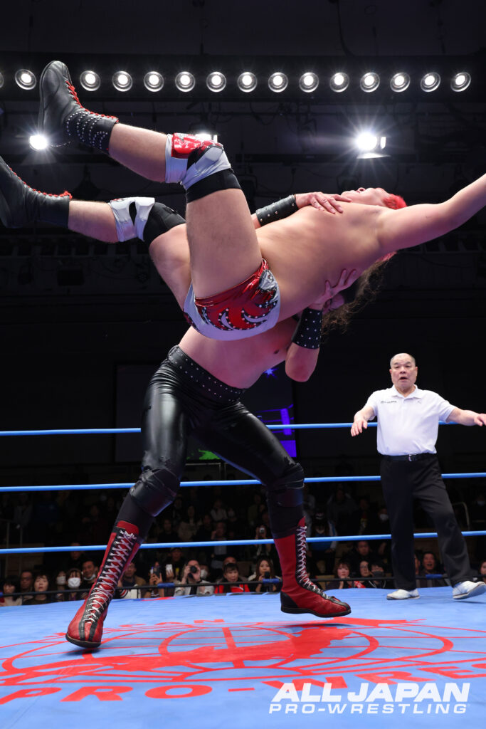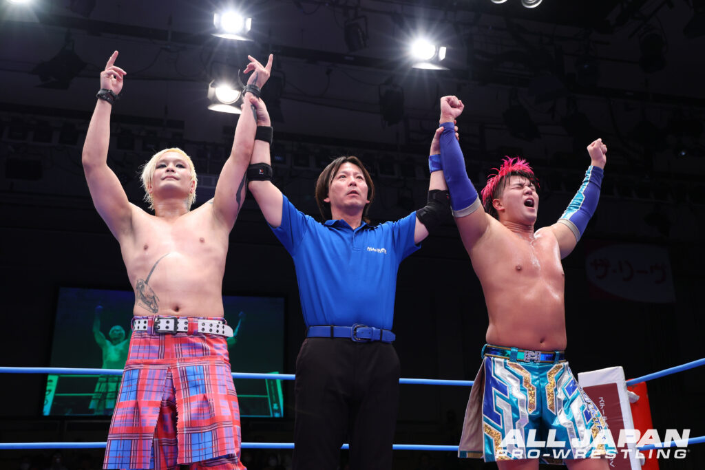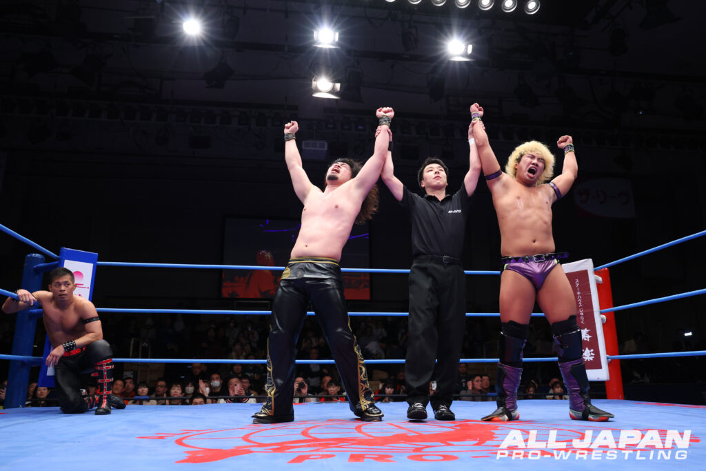 開幕戦のメインイベントは、“アツハヤ”青柳亮生&ライジングHAYATOと“バチバチヤンキース”立花誠吾&阿部史典の「ゼンニチJr.タッグフェスティバル」1回戦。亮生は1.25幕張大会で立花に破れ世界ジュニア王座陥落となっている。ジュニア戦士によるタッグマッチが後楽園ホール大会のメインイベントを飾るのは全日本プロレス史上初。世界ジュニア王者・立花と亮生が先発を買って出ると、アニキコールとアツキコールが交錯。亮生が華麗なステップからドロップキックを叩き込むと、バク転して立花のお株を奪うヤンキー座り。HAYATOと同時にプランチャを発射したが、立花と阿部は回避して場外戦で主導権を握った。南側客席の通路で大乱闘を繰り広げると、HAYATOが入場口の上から捨て身のダイブ。リングに戻ると亮生が捕まり、バチバチヤンキースは徹底した左ヒザ攻め。亮生の機動力を封じていく。立花はニークラッシャーから足4の字固め。痛みをこらえてブレーンバスターをリバースした亮生はHAYATOにタッチ。華麗なムーブでHAYATO が盛り返し、亮生のバックドロップのネックブリーカーを合わせる連携。シド・ヴィシャスは不発となり、阿部が逆襲のお卍固め。立花もクロスフェイスロックで亮生を捕まえた。大ピンチとなったHAYATOだったが、巧みに卍固めを切り返しインプラントボム。が、落とされた瞬間に阿部が丸め込む。HAYATOは伊良部パンチを被弾しながらもファルコンアローでグサリ。亮生とエルボーを打ち合った立花は、スピアで突っ込みアングルスラム。亮生はハンドスプリング・レッグラリアットで阿部を排除すると、立花にはフィッシャーマンズ・スープレックス3連発。ムーンサルトプレスは自爆となったが、立花のエルボーを受けきりカウンターの旋風脚。ハウザーインパクトからシド&ナンシーの発射体制に入る。ここは阿部がカット。立花がコーナー上の亮生を捕らえると、阿部の力を借りて雪崩式アングルスラム。ラリアットでねじ伏せて、仕上げのヤンキーハンマーを狙った瞬間、HAYATOが割ってはいり人でなしドライバー。ダブルのトラースキックで阿部を黙らせると、立花に合体式ハウザーインパクト。立花が肩を上げると、究極の空中殺法・シド&ナンシーを敢行。さらにダメ押しのファイヤーバードスプラッシュをクリーンヒットさせて熱戦に終止符。世界ジュニア戦の雪辱を果たして2回戦へ駒を進めると、Jr.タッグフェスティバル優勝&アジアタッグ奪取、アツハヤで結果を残すことをファンに約束した。
