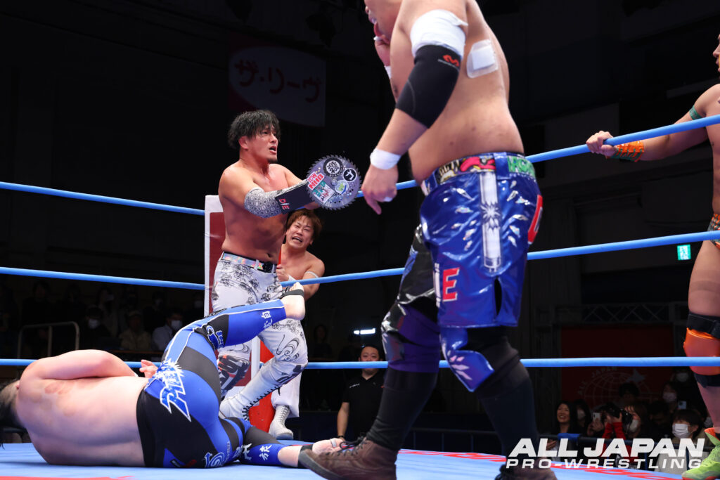 2.23大田区大会のゼンニチJr.タッグフェスティバル1回戦へ向けたダブル前哨戦。大田区大会では、「MUSASHI&小藤将太vs進祐哉&吉岡世起」、「田村男児&佐藤光留vs関札皓太&さくだとしゆき」が組まれている。先発の田村と関札がエルボー合戦、因縁のMUSASHIと吉岡もバチバチとやり合う。MUSASHIがエクスプロイダーを決めれば、吉岡も得意のシザースキック。掟破りの二天一流を狙ったが、MUSASHIは決めさせない。大日本プロレスデビューの同期タッグ・関札&さくだは、ススヨシとの対戦で息の合ったドロップキック。田村と佐藤も連続攻撃を仕掛けた。宮本との連携が上手くいかないMUSASHIに進が山折り。ドロップキックのコンボを鮮やかに極めたMUSASHIはファルコンアローで突き刺す。大技が連鎖する中、関札がプランチャを発射して、吉岡もラ・ケブラーダ。さくだが自作の凶器を持ち込むと、選手会副会長のMUSASHIが制止。さくだはMUSASHIの腕にチェンソーのような凶器を装着してしまう。レフェリーが凶器を注意していると、アームバーを極めた佐藤目掛け、宮本がセグウェイを発射。さらにハンドスプリングエルボーでススヨシを排除する。さくだがイス攻撃で佐藤を黙らせると、そのイスを持ったままスワントーンボムをズバリ。得意のハードコア殺法で3カウントを奪い、ゼンニチマットに大きなインパクトを残した。試合後もMUSASHIは凶器を外すことができず、そのままバックステージに下がっていった。