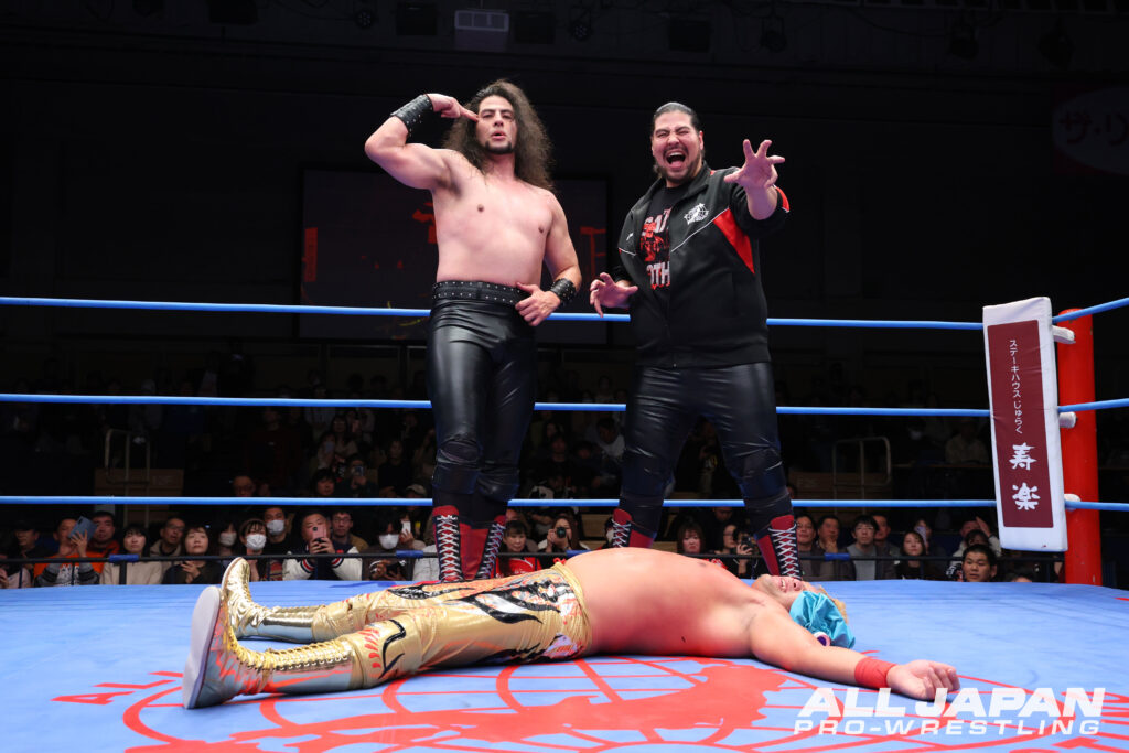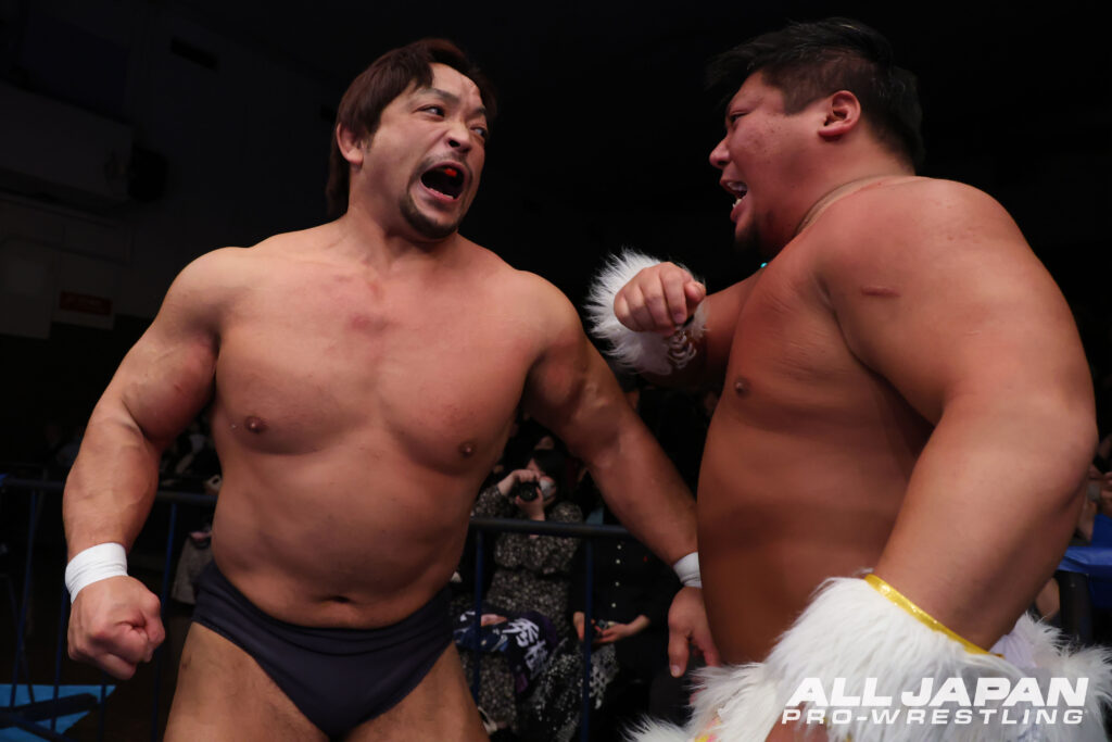 2.23大田区大会では、第103代世界タッグ王者“タイタンズ・オブ・カラミティ”綾部蓮&タロースと諏訪魔&鈴木秀樹、GAORA TV王者の関本大介と羆嵐が激突。静岡大会と富士大会でおこなわれた世界タッグ前哨戦では、綾部がデスルーレットで秀樹から連勝を飾っている。スーパーヘビー級が揃った注目のダブル前哨戦は、2月13日が誕生日で29歳になった綾部が秀樹と先発。ロープを押し込んだ綾部が頭を撫でると、秀樹はボディへのエルボーから飛びついてのフロントネックロック。コーナーに叩きつけられてもしつこく締め上げていった。タロースと諏訪魔の対戦が実現。力比べで優勢となったタロースは、肉弾戦に発展しても豪快に弾き飛ばして見せた。関本と羆嵐も正面衝突。エルボー、ラリアットのラリーでも両者一歩も引かない。再び綾部と秀樹のマッチアップとなり、秀樹がぶら下がり式首4の字固め。綾部もブレーンバスターで投げ、タロースの串刺しボディアタックからフルネルソンバスター。得意のコンビネーションを狙ったが、諏訪魔がカットに入る。蘇生した秀樹とドロップキックで競演しタロースを場外に落とした。綾部には合体式ダブルアーム・スープレックス。容赦なく顔面を蹴り上げていった秀樹は、一気にスリーパーホールドで締め落とした。試合後も締め上げ、タロースにもスリーパーを仕掛け、チャンピオンチームに屈辱を与えてバックステージに姿を消した。