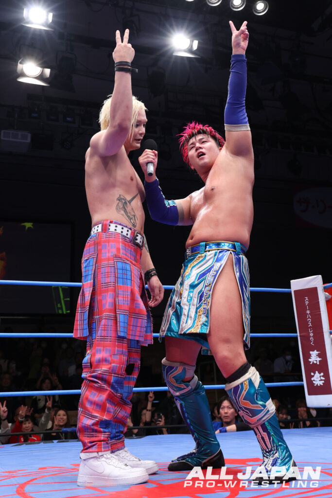 亮生「そういうことだー!やったね、HAYATOさん。どっかでも言ったんだけど、アツハヤってまだ結果を出してないんだよ。知らなかったでしょ?今の反応を見てもわかる通り、アツハヤって何にも残してないんですよ。だから、今回のゼンニチJr.タッグフェスティバルにアツハヤ懸けてます。この勢いのまま優勝して、アジア、アツハヤで巻くからさ。楽しみにしといてください。全日本プロレス、さらに向こうへ。Plus Ultra!」