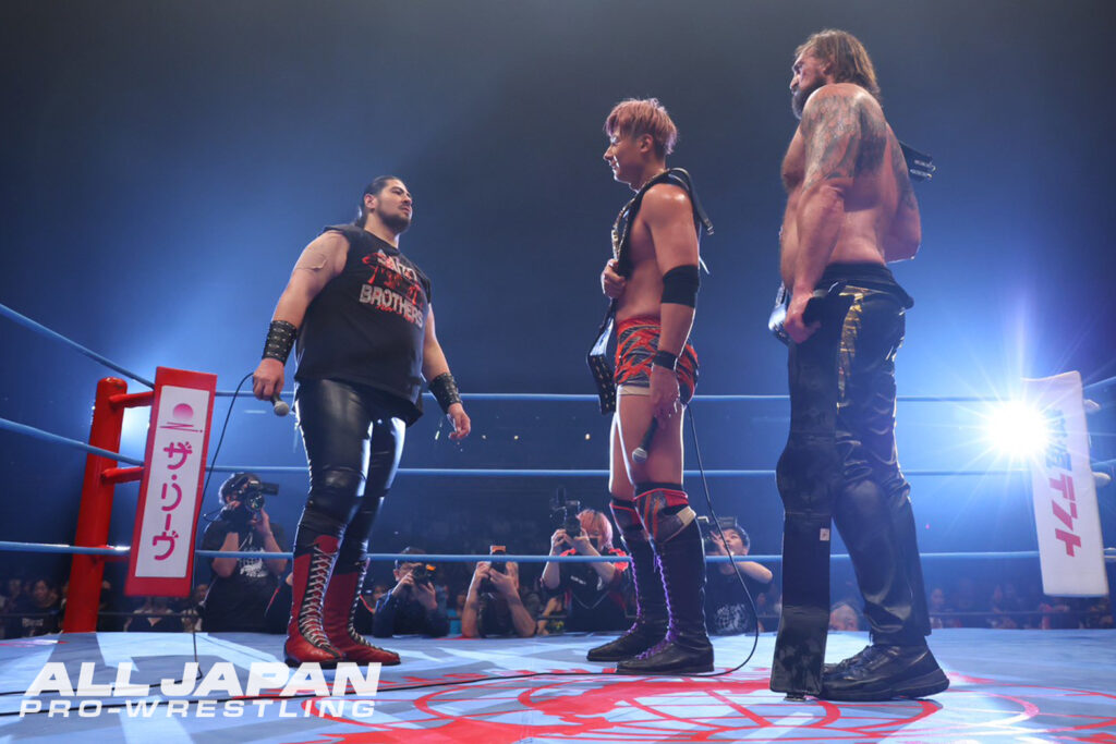 タロース「ヒデキさん、スワマさん、2人はタフ中のタフだった。タフで老獪な2人だった。あの2人の戦術は好きではないし、追い込まれもしたが、いつものようにタイタンズ・オブ・カラミティが世界最高のタッグチームであることを証明した。そして、次の後楽園では斉藤ブラザーズ。全日本プロレスの最高峰のタッグチームを倒すことで、俺たちが世界最高のタッグチームであることを決定的なものにしてみせる」