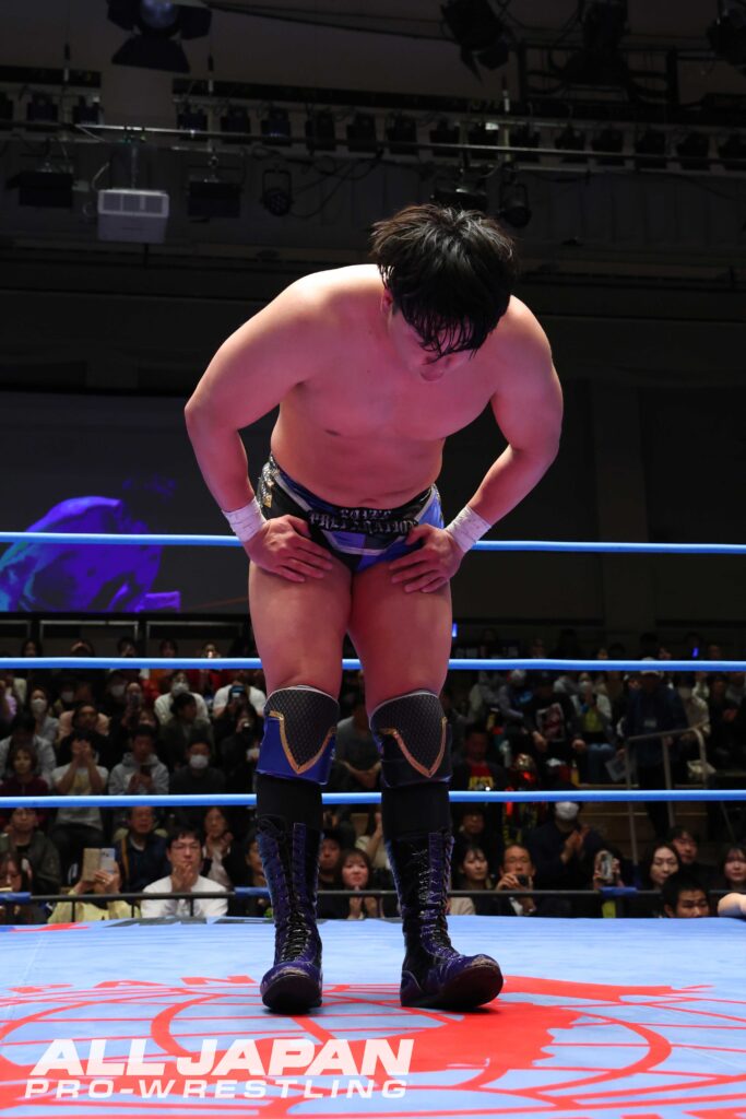 昨年11月に運転免許失効状態で車両同士の衝突事故を起こし、減給処分と2月28日まで謹慎処分となっていた青柳優馬が第0試合で復帰。全日本プロレスのジャージを着て入場した優馬は、温かい拍手と声援に迎えられると、リングに上がり四方に礼。選手コールを受け、鈴木秀樹とのシングルマッチに臨んだ。優馬にとって112日ぶりとなる試合がスタートすると、リングの感触を確かめながらグラウンドレスリングの攻防を展開。15分1本勝負は、残り3分となったところで、優馬のネックロックが極まったが、首を抜いた秀樹は上のポジションをキープしてプレッシャーを与えていく。優馬がバックを奪っても、秀樹がアームロックで捕獲。苦悶の表情を浮かべた優馬は、前転をしてなんとか脱出。最後まで打撃を打ち合うことなく時間切れ引き分けとなった。優馬は試合前と同じように四方に礼をしてリングを降りた。バックステージでは、ファン、選手、スタッフ、関係者に謝罪し、感謝の想いを伝えると、「これからは、本当に私生活はもちろん、プロとしてもしっかりとリング上を充実させたうえで、プライベートをしっかり身を引き締めて生活して、ひとつひとつのことをしっかりと丁寧にこなして、また皆さんからの信頼を得られるようなプロとしての生活を送っていきたいと思います」と誓った。