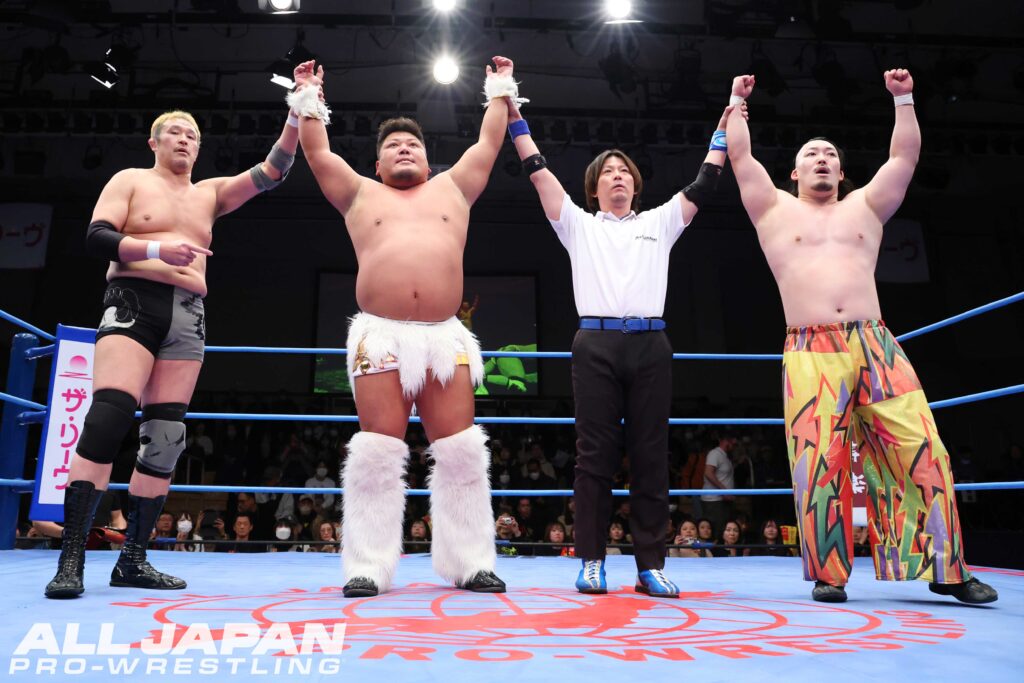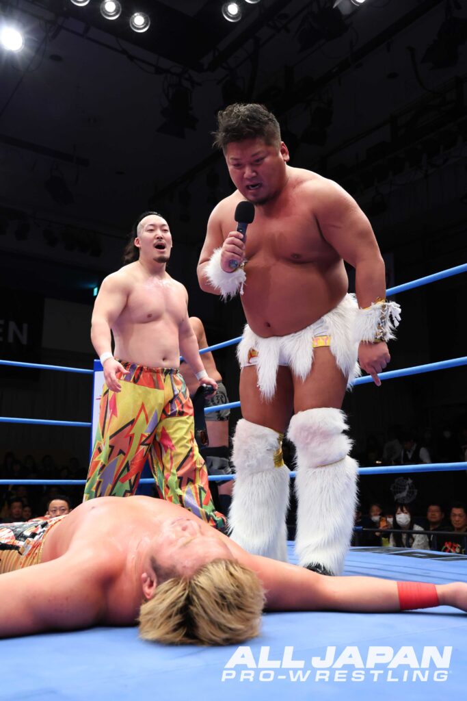 羆嵐「最初で最後の前哨戦。とりあえず直接ピンは取ってないけど、勝って終われたんで。まぁ俺は、WRESTLE-1のみんなの想いを背負って、メジャー団体の全日本プロレスの三冠ヘビー級のベルトに1人でね、チャンピオンと1対1でリング上で対峙しようと思ったんだけど、助っ人がね、超強力な助っ人が来てくれた」
