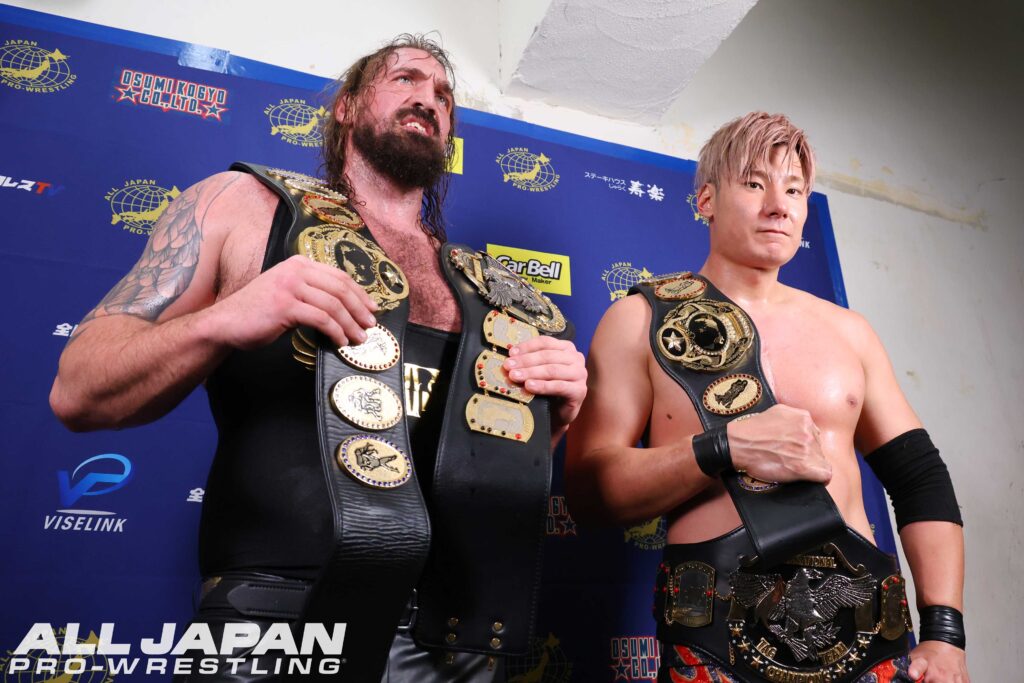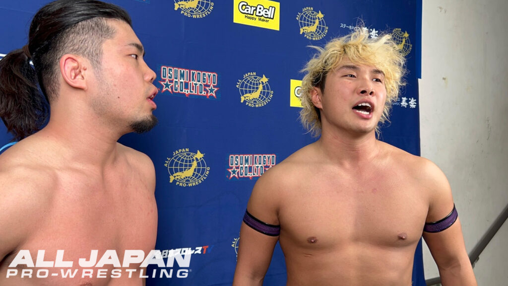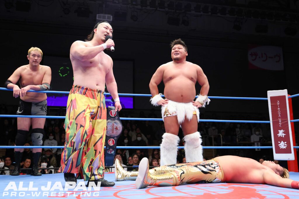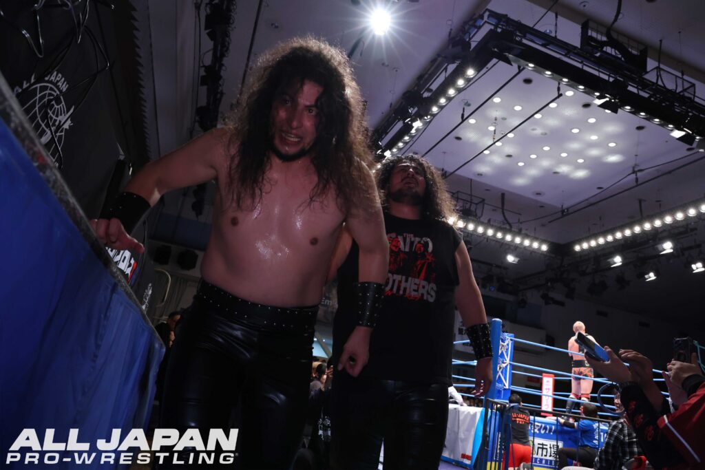 綾部「世界タッグV3達成だ。やっぱり斉藤ブラザーズ、めちゃめちゃ強かったし、めちゃめちゃ楽しかったよ。まぁ、我々、Titans of Calamityの次くらいには強いんじゃないか?我々、TOCが見せる絶望はまだまだ続くぞ。次、20日の八王子でも斉藤ブラザーズとそれぞれ、シングルが決まっているからな。そこでも絶望を味合わせてやる。今日で分かっただろ。全日本プロレスのタッグ戦線、斉藤ブラザーズだけじゃないってことをな。まだまだ、この日本、いや世界一デカいか。まだまだ、このタッグチーム・TOCに注目しろ。つまりだ。今後も、この全日本プロレス、プロレス界、頂に立つのは我々Titans of Calamityだ」