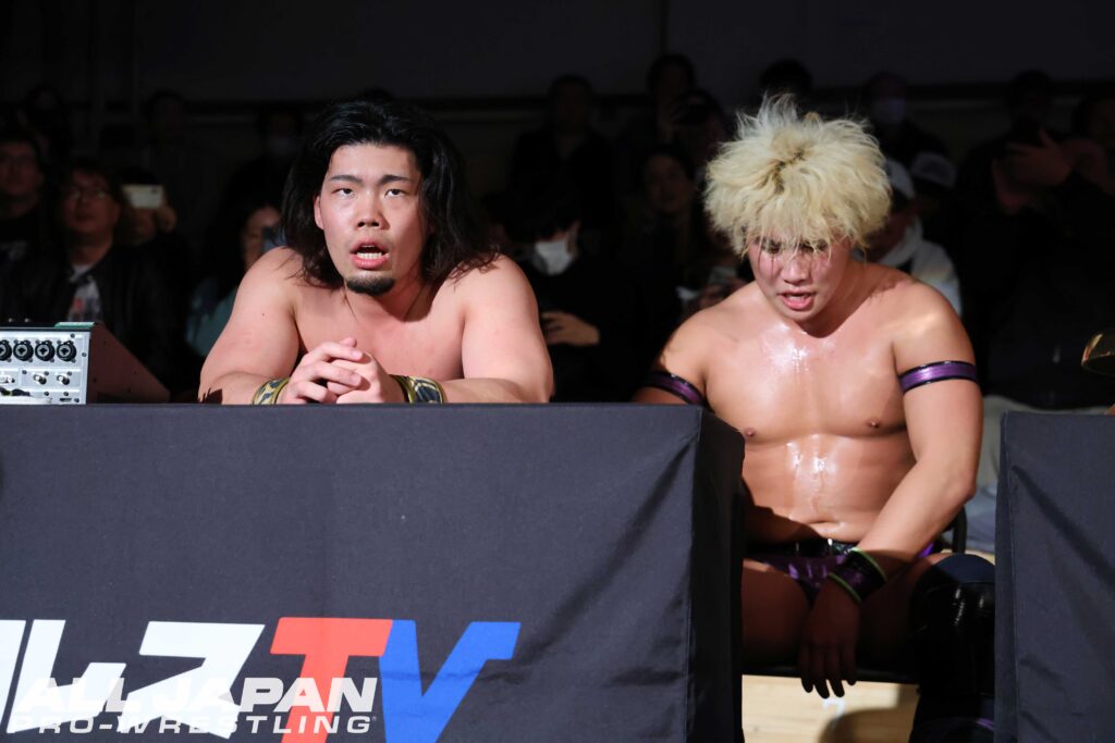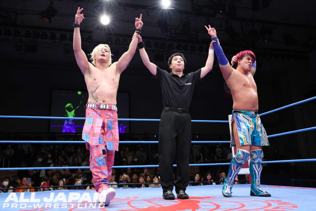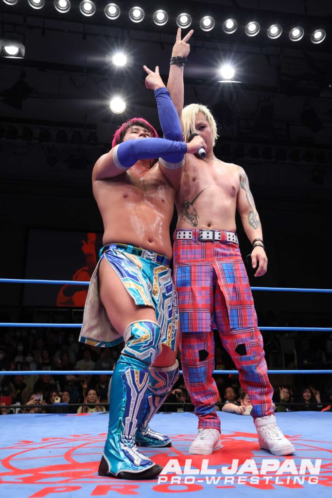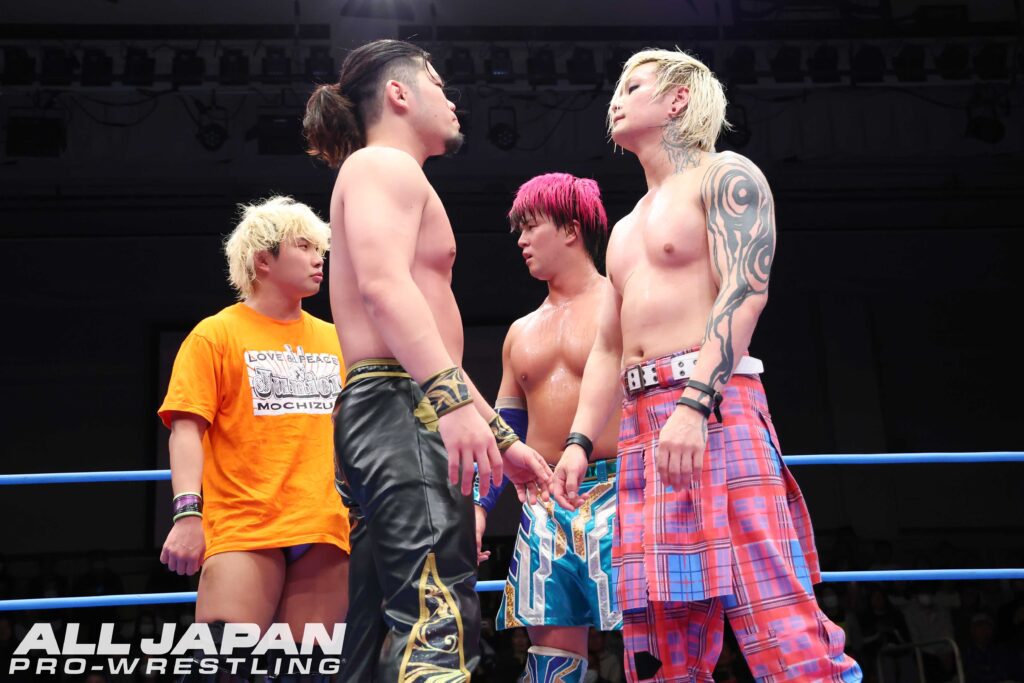 2.15後楽園大会で開幕したゼンニチJr.タッグフェスティバル。今大会ではベスト4が激突。井上凌&望月ジュニアの越境タッグは、開幕戦で“ミスター斉藤”土井成樹&セニョール斎藤に逆転勝利して、チーム名を“LOVE&UGLY”と発表。“変態男児”田村男児&佐藤光留は、2.23大田区大会で関札皓太&さくだとしゆきとのハードコアな一戦を制して、1回戦を突破した。
