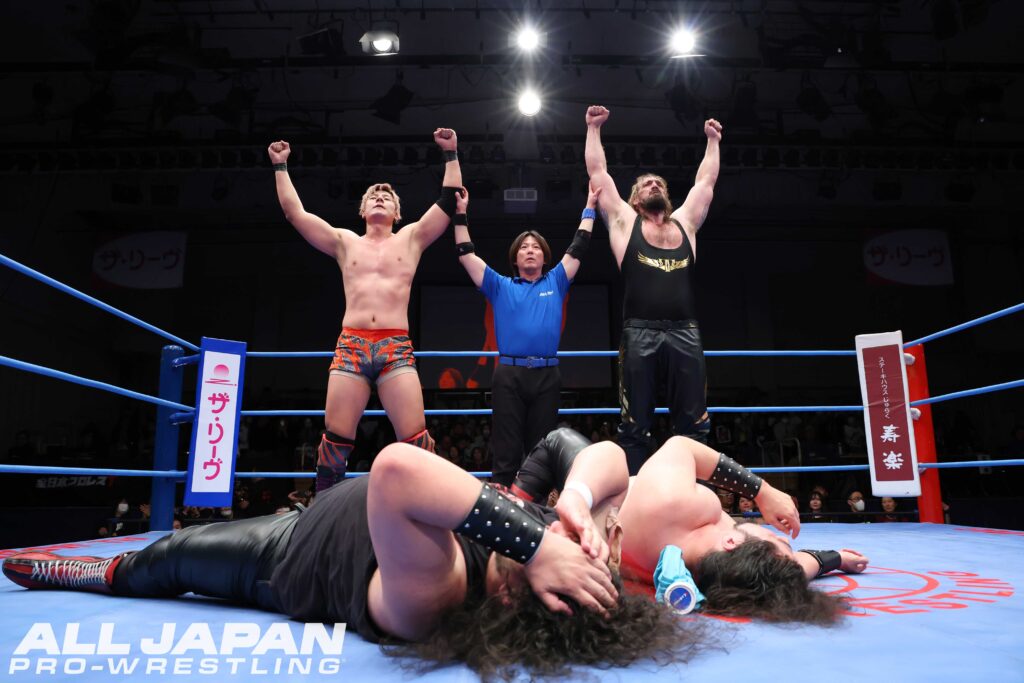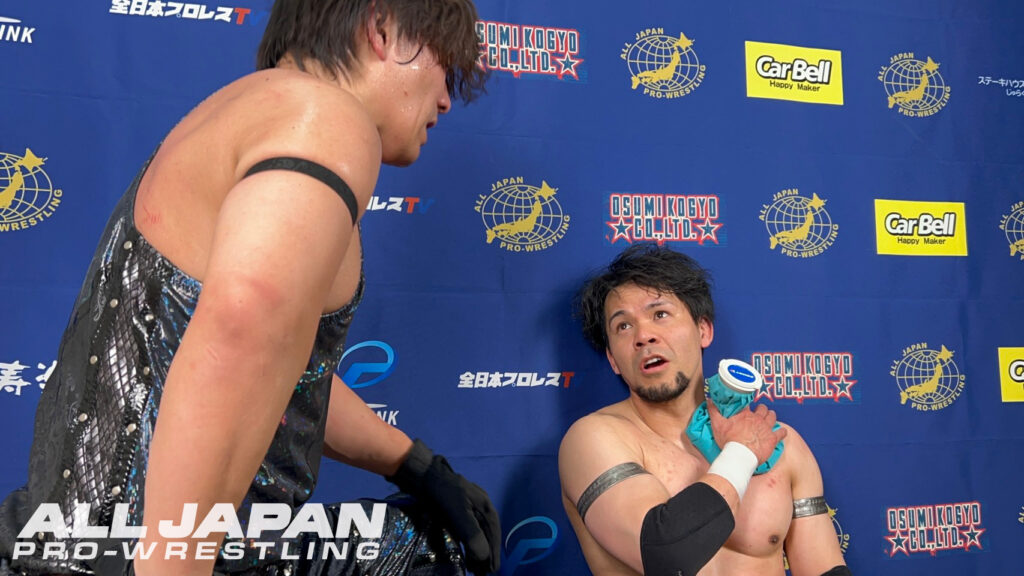 綾部「さぁ、斉藤ブラザーズを粉砕してV3達成だ。これで分かっただろ?全日本プロレス、タッグ戦線、いやタッグ戦線に限らず、斉藤ブラザーズの印象が強いかもしれないけど、斉藤ブラザーズだけじゃないってことをな。今日で絶望を味わったはず。でもこれで終わらない。5日後、八王子。斉藤レイ、今日と同じ、いや、それ以上の試合で絶望を味わってもらおうか。そして、休憩明けにチャンピオン・カーニバルの組み合わせ、ブロックが出ていたな。開幕戦で斉藤ジュンらしいな。斉藤ブラザーズ、今日と合わせて、八王子、そして開幕戦の後楽園と連続粉砕といこうか」