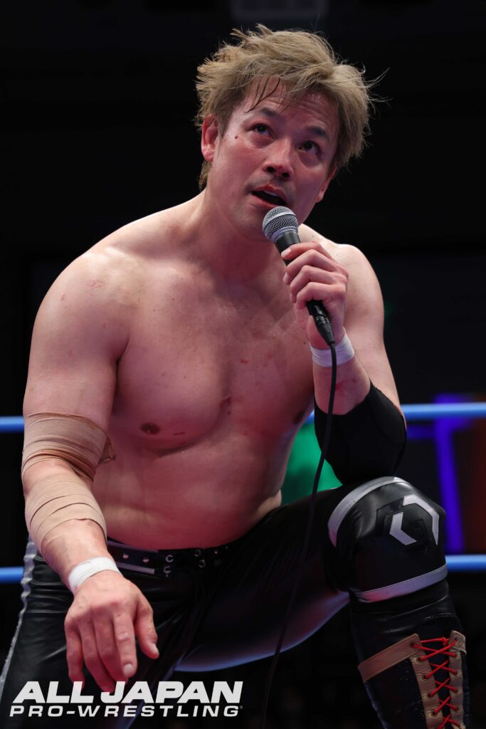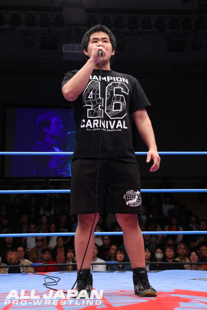 潮﨑「キツい…。まずは、これだけの歓声、これだけの応援、ありがとうございました。安齊勇馬、強いな。全日本プロレス、チャンピオン・カーニバル、約11年ぶりに帰ってきました。お客さんのこれだけの熱さ、これだけの盛り上がり、本当に感謝します。今日、初日だよ?初日でもこれくらいの声を上げてくる、本当に嬉しい。ありがとう。この歓声、みんなの声、みんなの想いに応えるよう、俺はひとつ、このチャンピオン・カーニバルの期間だけはHAVOC潮﨑豪じゃない。全日本プロレス潮﨑豪だ!まだ今日、始まったばかり。初日でこの熱さ。このあとが楽しみだ。全日本プロレス、盛り上がっていこうぜ!ありがとう!」