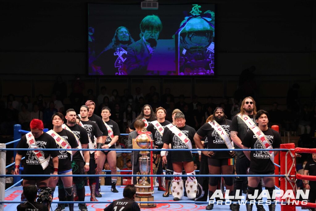 46回目となる春の祭典「チャンピオン・カーニバル2026」が開幕。今年は2ブロック制による総当たりリーグ戦で全16選手がエントリー。最終戦となる5.17大田区総合体育館大会の決勝トーナメントでAブロック1位とBブロック2位、Aブロック2位とBブロック1位が激突し、同大会でそれぞれの勝者による優勝決定戦を時間無制限1本勝負で行い、春の栄冠を争う。入場式にはDRAGONGATEの菊田円を除く15選手が参加し、各選手が火花を散らしていた。