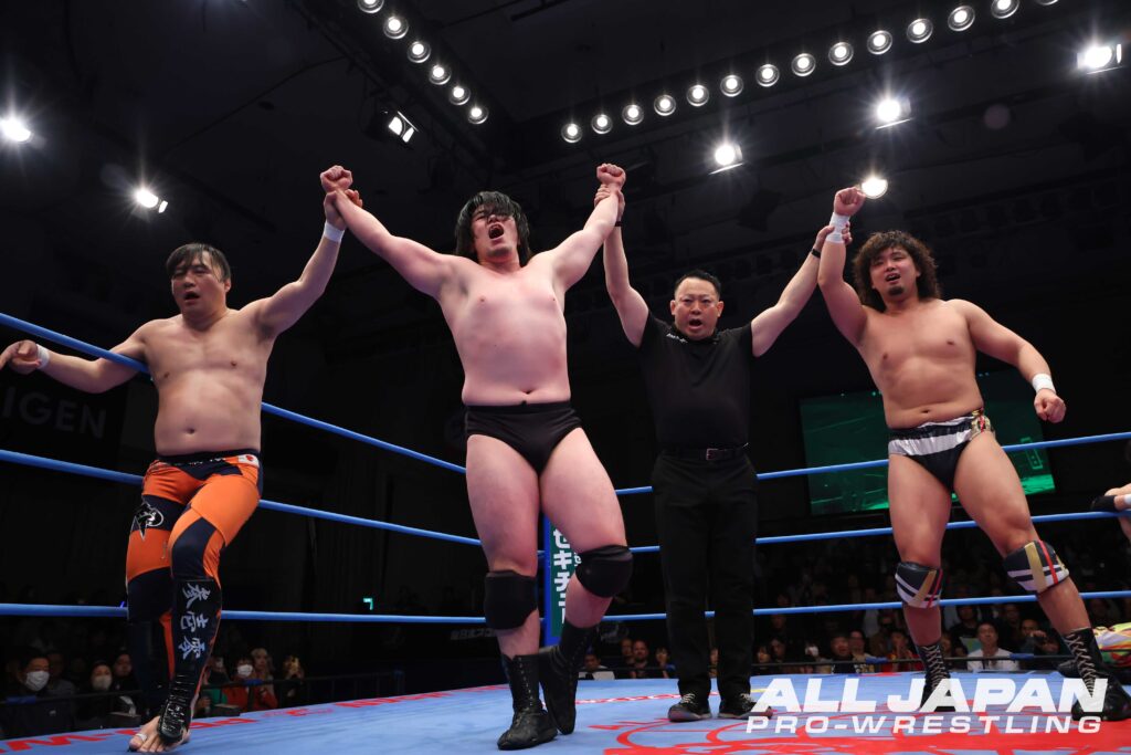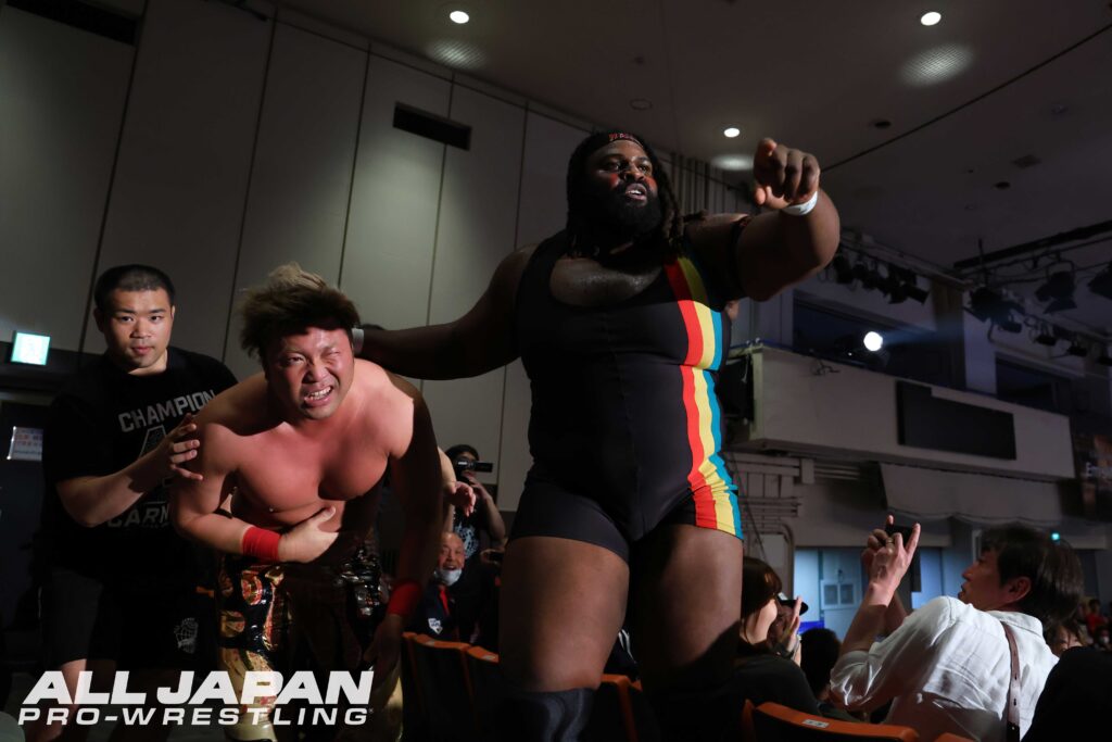 休憩時間明けの8人タッグマッチでは、チャンピオン・カーニバル2026のAブロックにエントリーしている三冠ヘビー級チャンピオン・宮原健斗とオデッセイが直接対決。両者の公式戦は、4.23新宿大会でおこなわれる。MUSASHIが芦野&オデッセイとHAVOCポーズを決めて入場すると観客にHAVOCコールを煽る。先発で亮生と対峙したMUSASHIは高速のバトルでファンを魅了も、ドロップキックを被弾して出鼻をくじかれる。それでも井上が盛り返すと、場外のアツハヤにノータッチ・トペ・コンヒーロをクリーンヒットさせた。HAVOCは南側客席通路になだれ込み、宮原と本田を衝突させるなど大暴れ。宮原とオデッセイの前哨戦では、宮原がフロントハイキックを放てば、オデッセイも全体重を浴びせるラリアット。優勢となったオデッセイは腰をくねらせるポーズから串刺し攻撃を決め、助けに入った本田もまとめてサイドバスターで叩きつけていった。オデッセイのリフトアップから芦野がジャーマン。MUSASHIがエストレージャフトゥーロを放つと、井上がレッグラリアット、バズソーキックで金星奪取へ突き進む。ローンバトルを強いられた宮原だが、パートナーに救われると、アツハヤのダブル・ハウザーインパクトから一気にシャットダウン・スープレックス・ホールド。あっという間に3カウントを奪うと、コーナーに上がり三冠ベルトを誇示した。