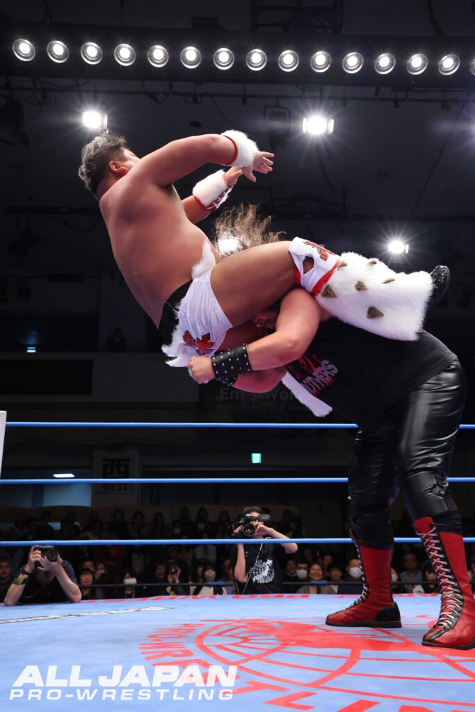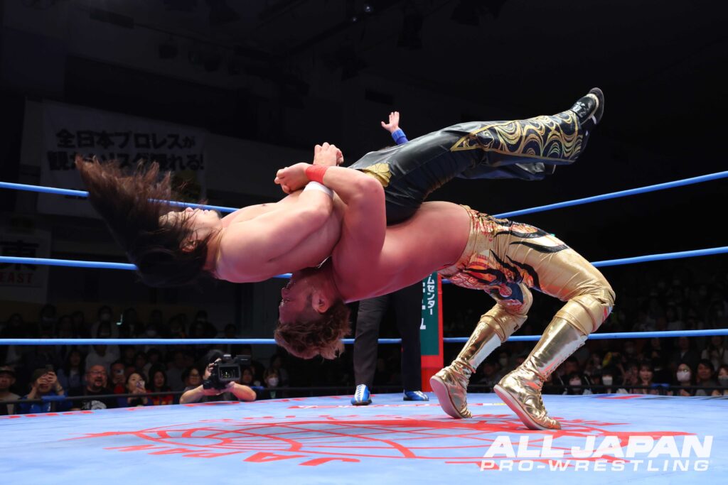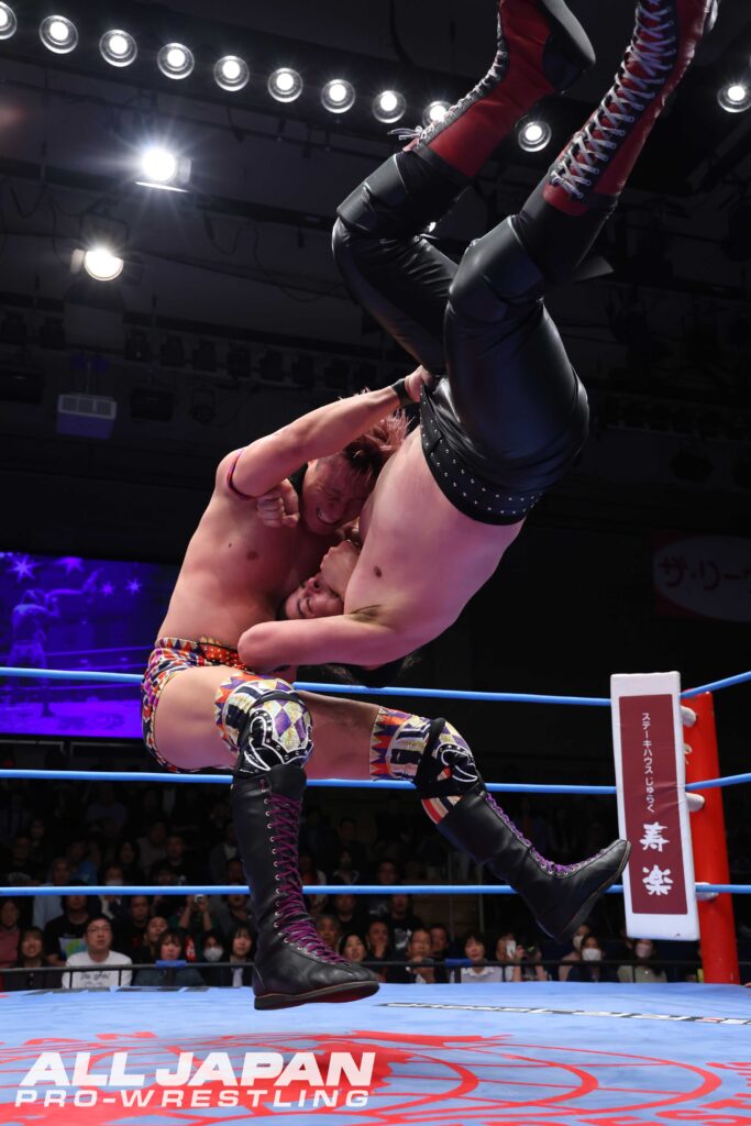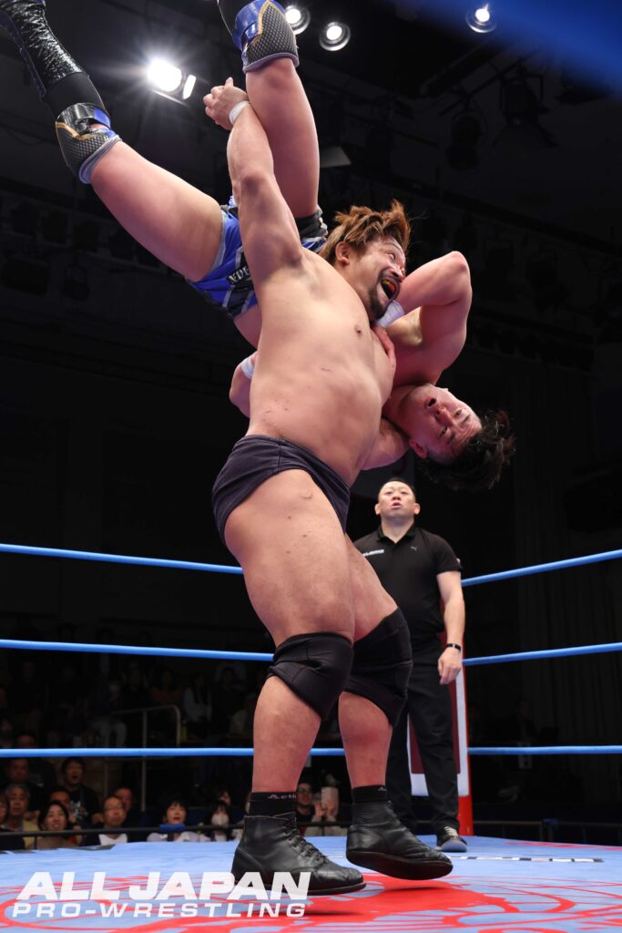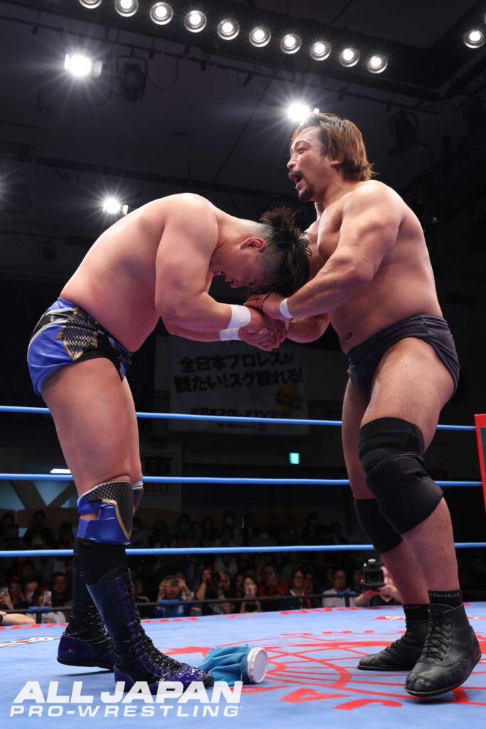 「チャンピオン・カーニバル2026」の戦いは、昨年の覇者・斉藤レイ〈4年連続4度目の出場〉とGAORA TV王者・羆嵐〈2年連続4度目の出場〉のAブロック公式戦で幕開け。2024年9月の王道トーナメント1回戦では、レイがBBQボムで勝利している。激闘の春を体現するスーパーヘビー級バトルは、ゴングと同時に後楽園ホールを揺るがすような肉弾戦が繰り広げられ、力比べで意地を見せた羆嵐は豪快なスープレックス。場外戦ではレイのタックルを鉄柱に誤爆させ、150kgをアルゼンチン・バックブリーカーで担ぎ上げた。連覇を狙うレイもセントーンを回避。ヒップドロップ、串刺しラリアットと重爆ファイトを仕掛ける。羆嵐がボディスラムでやり返し、セカンドロープからのダイビング・セントーン。ラリアットで正面衝突すると、羆嵐が渾身の一発で打ち勝ち雄叫びを上げる。しかし、ブレーンバスターはレイがリバース。さらにレイはボディアタックを受け止めて張り手。逆にボディアタックで圧殺するとBBQボムが大爆発。羆嵐を討ち取り、史上4人目となる連覇へのスタートダッシュを決めた。