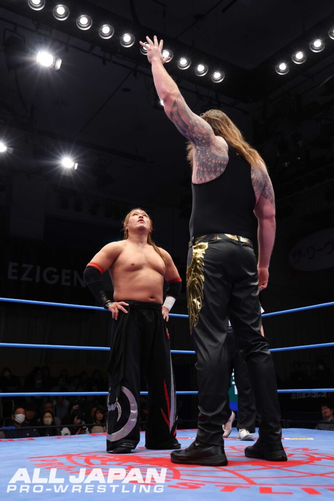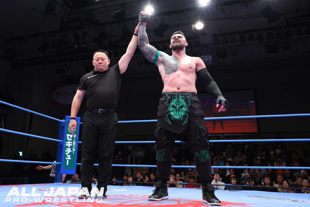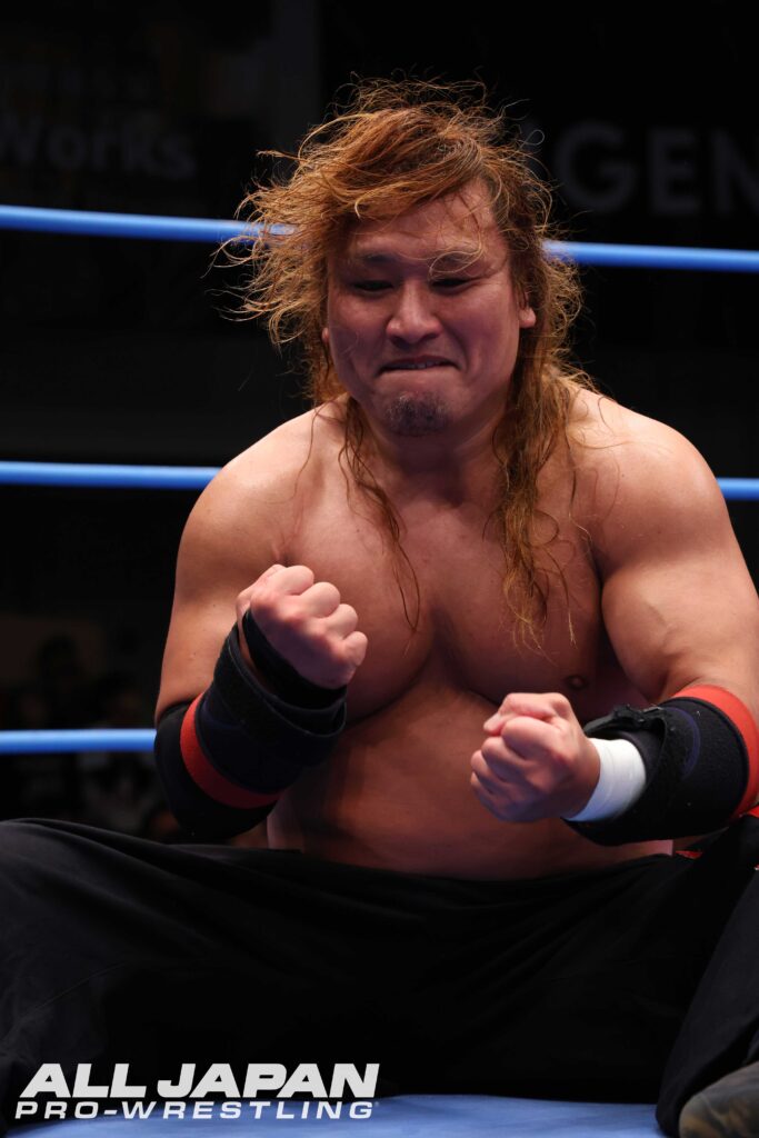 サイラスのシリーズ全戦欠場を受け、最年少優勝記録保持者(2022年、26歳6カ月)・青柳優馬〈8年連続8度目の出場〉の緊急出場が決定。開幕戦は2016年に優勝を果たしている関本大介〈9年ぶり4度目の出場〉との対戦となった。10年前のシングルマッチ(2016年1月18日、D-RIZE新木場大会)では、関本がサソリ固めで勝利している。優勝経験者同士のBブロック公式戦は、関本が腕を締め上げながら優馬の動きをコントロール。優馬がドロップキックで応戦しても関本は分厚い肉体でぶつかっていく。アルゼンチン・バックブリーカーでリングサイドを歩き回り、自慢のパワーをアピールすると、リング上でも逆エビ固めでスタミナを削った。防戦一方の優馬だったが、串刺し攻撃を止めてミサイルキック。串刺しエルボーの連打からダイビング・ボディアタックを発射してフロントネックロックで絡みつく。優馬をエプロンに追いやった関本はタックルで場外に落とし、追撃のトペ・スイシーダ。鉄柵に頭から突っ込んで流血したが、大関本コールが発生した。カウント9でリングインした優馬に串刺しタックルからブレーンバスター。さらにセントーン、ボディプレスで追撃。コーナー最上段に上がると、優馬が下からドロップキック。雪崩式ブレーンバスター、ジャーマン・スープレックスを喰らってもすぐに立ち上がった関本は、ラリアットでシャットアウト。ぶっこ抜きジャーマンを切り返した優馬は丸め込みを連発。ラリアットで正面突破すると再びジャーマン。ロックスターバスターでも3カウントは入らない。THE FOOLは不発となり、関本がフルパワーのジャーマン。ラリアットでも優馬が沈まないとみるや、ビッグバンカタストロフィで15分超えの熱戦に終止符。勝ち点2をもぎ取った。