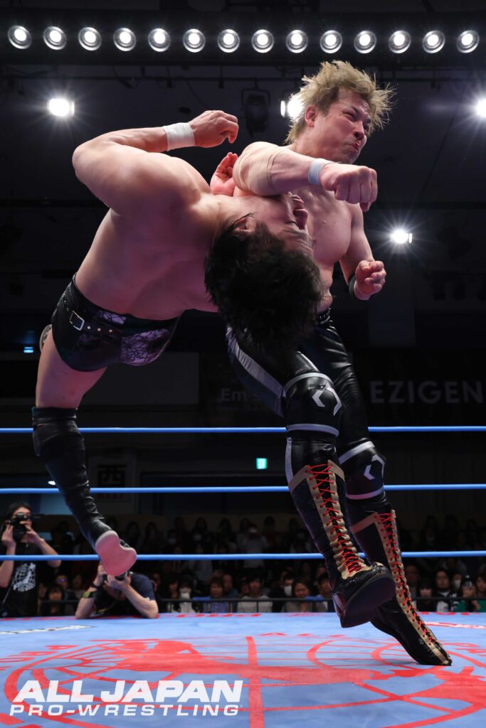 2年8か月ぶりの一騎打ちは、じっくりと互いの進化を確かめ合うと、安齊がドロップキックをズバリ。場外にエスケープした潮﨑を追いかけてエルボーを打ち込んでいく。潮﨑がやり返そうとしても鉄柵を踏み台にしてのエルボーアタック。潮﨑は低空ドロップキックで流れを変え、鉄柵・鉄柱・エプロンを使ったニークラッシャー。非常なヒザ攻めで機動力を封じた。長い場外戦を経てリングに戻ると、潮﨑はリバースハーフボストンクラブ、左ヒザへの逆水平チョップで主導権。ミサイルキックで突破口を開いた安齊は、串刺しジャンピングエルボーからスロイダー。キレのあるドロップキックからジャーマンを狙ったが、決めさせない潮﨑がフライング・ショルダーからコーナーに詰めてマシンガンチョップ。何十発と喰らっても前に出続けた安齊は必死にエルボーで喰らいつく。投げっぱなしジャーマン2連発からジャンピング・ニーアタックも潮﨑がラリアットを叩き込んでダブルダウン。両者カウント8で立ち上がり、安齊がジャンピング・ニーアタック。ロープに振っての一発も決まり、試合を終わらせにかかる。潮﨑が抵抗しても再びジャンピングニー。さらにダブルニーアタックからギムレットで仕上げにかかった。潮﨑はフランケンシュタイナーで切り返すと、捻りを加えて叩きつける雪崩式ブレーンバスター。渾身のゴーフラッシャーはカウント2.9。リミットブレイクの体制に入ると、抵抗する安齊のヒザに豪腕ラリアット。テキサスクローバーホールドでギブアップを迫る。拷問を抜け出した安齊はバックドロップでぶん投げ、後頭部にヒザ。正面から顔面を射抜いてカバーも仕留められない。潮﨑がカウンターのラリアット。執念で立ち上がった安齊を豪腕ラリアットで一回転させる。安齊が驚異的な粘りを見せても、右ヒジのサポーターを外して、再び豪腕をフルスイング。限界を超えた一戦を制した。初優勝へ会心のスタートを切った潮﨑は、ファンの声援に感謝すると「チャンピオン・カーニバルの期間だけはHAVOC潮﨑豪じゃない。全日本プロレス潮﨑豪だ!」と宣言。春の祭典の熱気を11年ぶりに感じ、「このあとが楽しみだ。全日本プロレス、盛り上がっていこうぜ!」と叫んで開幕戦を締めた。