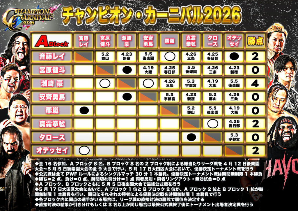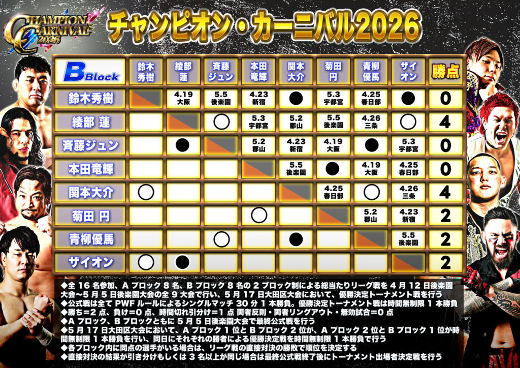 【星取表】「チャンピオン・カーニバル2026」4.18名古屋大会終了時点