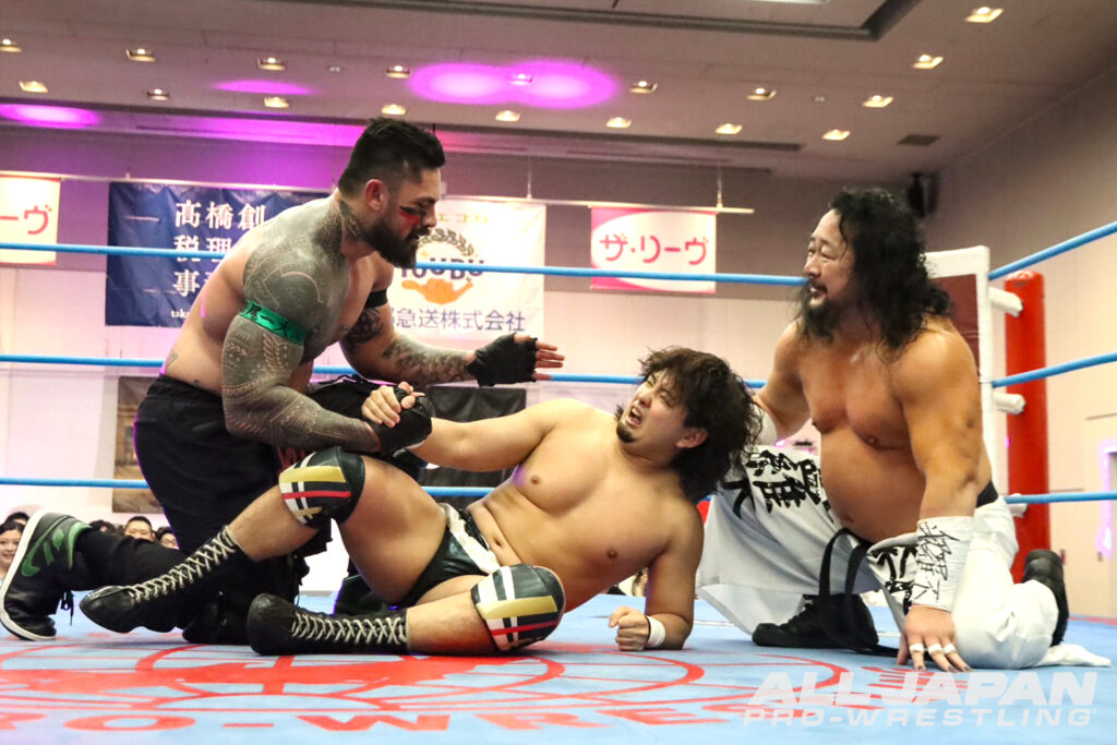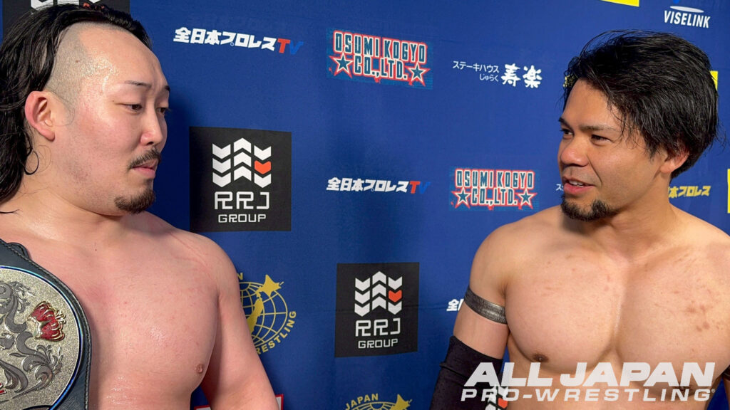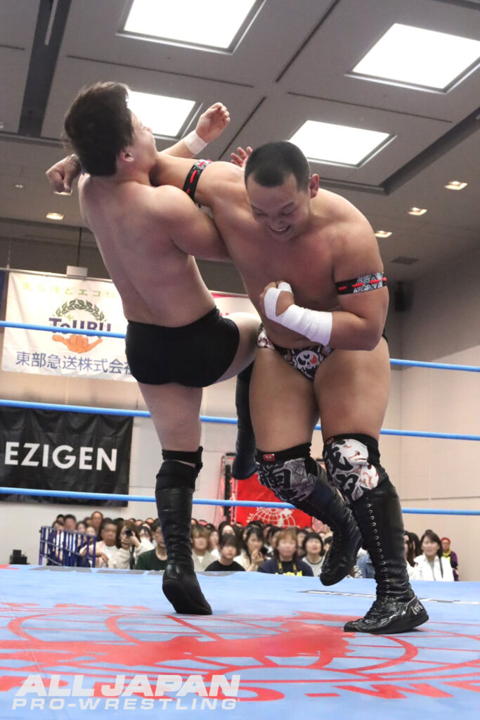 三冠ヘビー級チャンピオンとしてのカーニバル制覇を狙う宮原健斗は4.18名古屋大会のメインイベントで“宿敵”潮﨑豪に敗れて初戦でつまずく形に。安齊勇馬も開幕戦のメインイベントで潮﨑に敗れており、大阪で2戦目を迎えた。宮原と安齊は昨年のゼンニチ大晦日で三冠王座を争い、宮原が28分37秒の熱戦の末、シャットダウン・スープレックスホールドで安齊を下している。カーニバルで同じブロックになったのは今年が初。激闘連続となった大阪決戦を締めくくるAブロック公式戦は、グラウンドの攻防、場外戦と両者一歩も譲らず会場の熱気が高まる。徐々に宮原が三冠王者の力を見せつけ貫禄の試合運び。新人時代をフラッシュバックさせる逆エビ固め、容赦ない顔面蹴りで安齊の心を折りにいった。苦しい時間が続いた安齊だったが、起死回生のミサイルキック。串刺しエルボーからスロイダーと得意のパターンに持ち込んだ。ドロップキックを直撃させて渕正信直伝のフェイスロック。エプロンの攻防でパイルドライバーを防いだ安齊は、場外の宮原目掛けジャンピング・ニーアタック。宮原が場外カウント9で生還したところで試合開始から20分が経過。魂を削り合うようなエルボーのラリーから宮原が垂直落下式ブレーンバスター。ブラックアウトを連発すると、安齊がヒザを受け止めて鋭いエルボー。コーナー上の宮原にジャンピング・ニーを叩き込み、雪崩式ダブルアーム・スープレックスで追撃する。宮原のラリアットを読んで再びフェイスロックで締め上げた。さらに奥の手・ギムレットで仕上げにかかったが、抜け出した宮原がブラックアウト。両者のヒザが交錯すると、かろうじて打ち勝った安齊が後頭部、顔面と2連発でジャンピング・ニーアタック。ランニング・ダブルニーでも3カウントは奪えず、サポーターをずらして膝をむき出しに。カウンターのブラックアウトでピンチを脱した宮原は一気にギアを上げてもう一発。残り時間1分。シャットダウン・スープレックスを決めるべく、宮原が安齊の両腕をロック。沈むわけにはいかない安齊も振り切ってジャンピング・ニー。ギムレットを仕掛けに行くと、切り抜けた宮原がシャットダウン狙い。ここでタイムアップのゴング。両者が1点を分け合う結果となった。初白星がお預けとなった宮原だったが、「優勝は俺の中ではイメージができているんだ」と語り、次戦(4.23新宿)オデッセイとのシングル初対決へ闘志を燃やす。安齊も「危険なのは変わりねぇな」と警戒し、新宿大会の真霜拳號戦へ気合いを入れ直した。