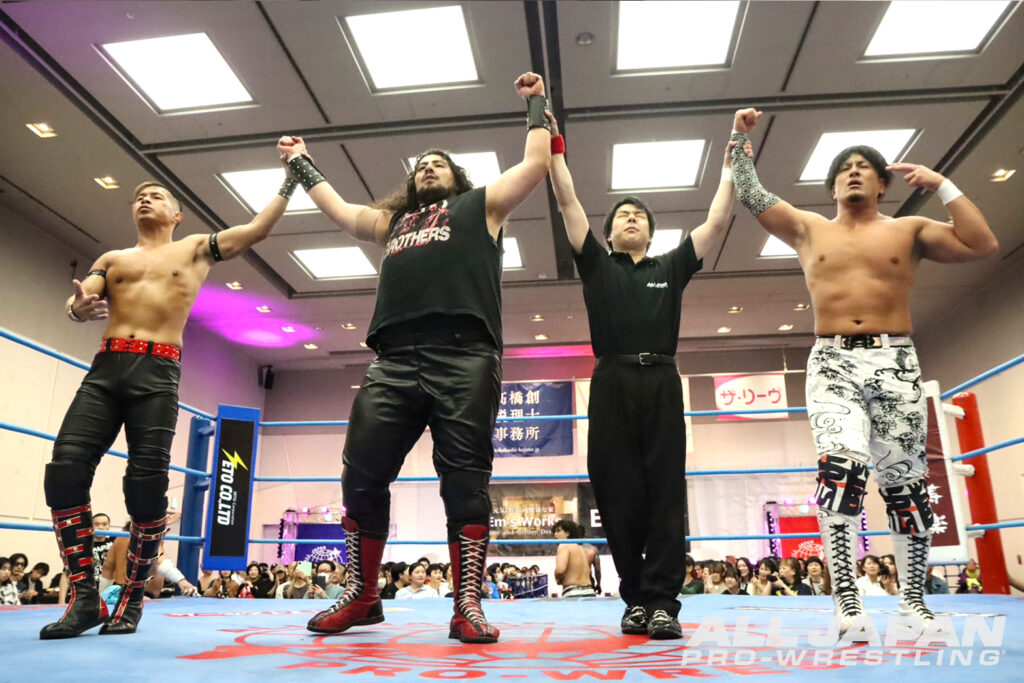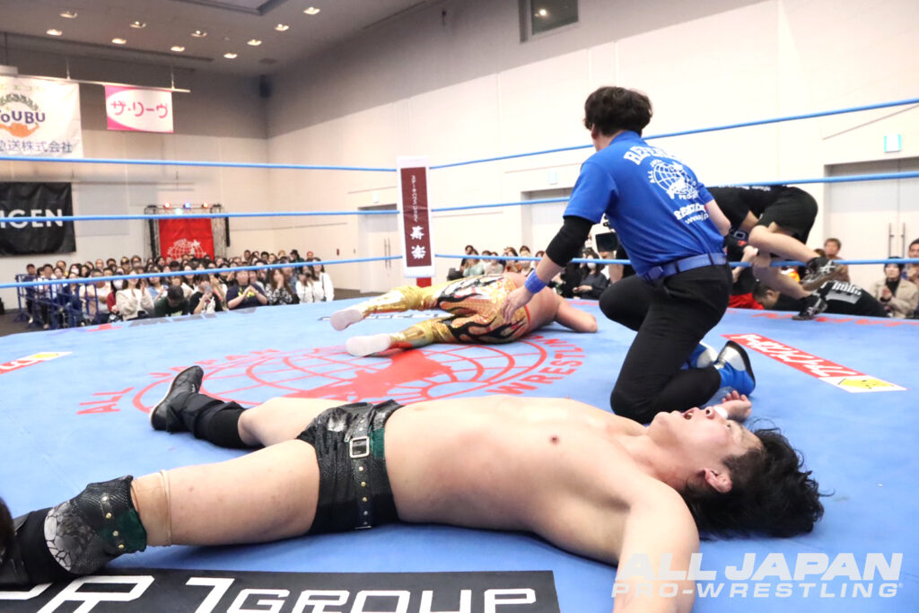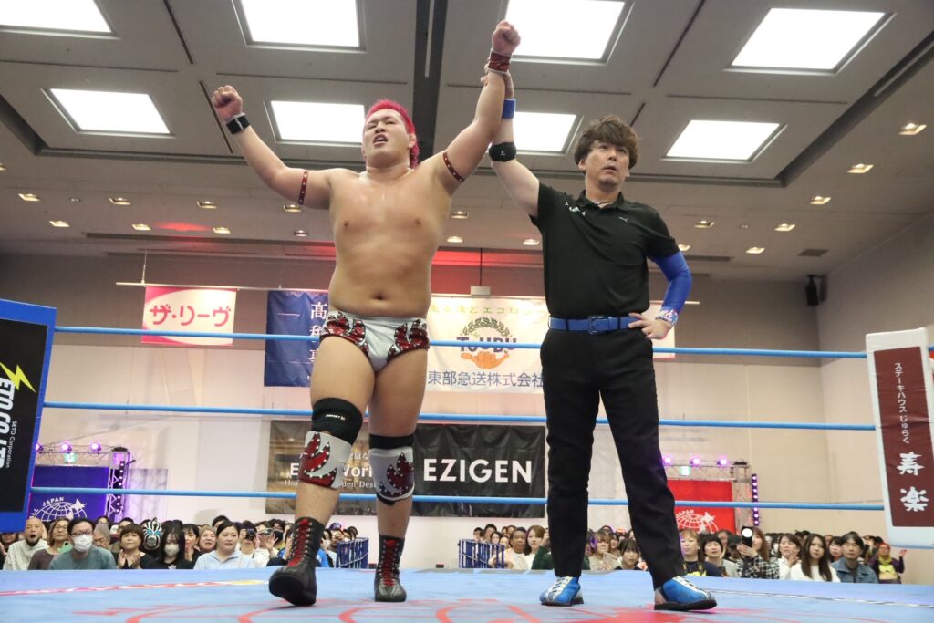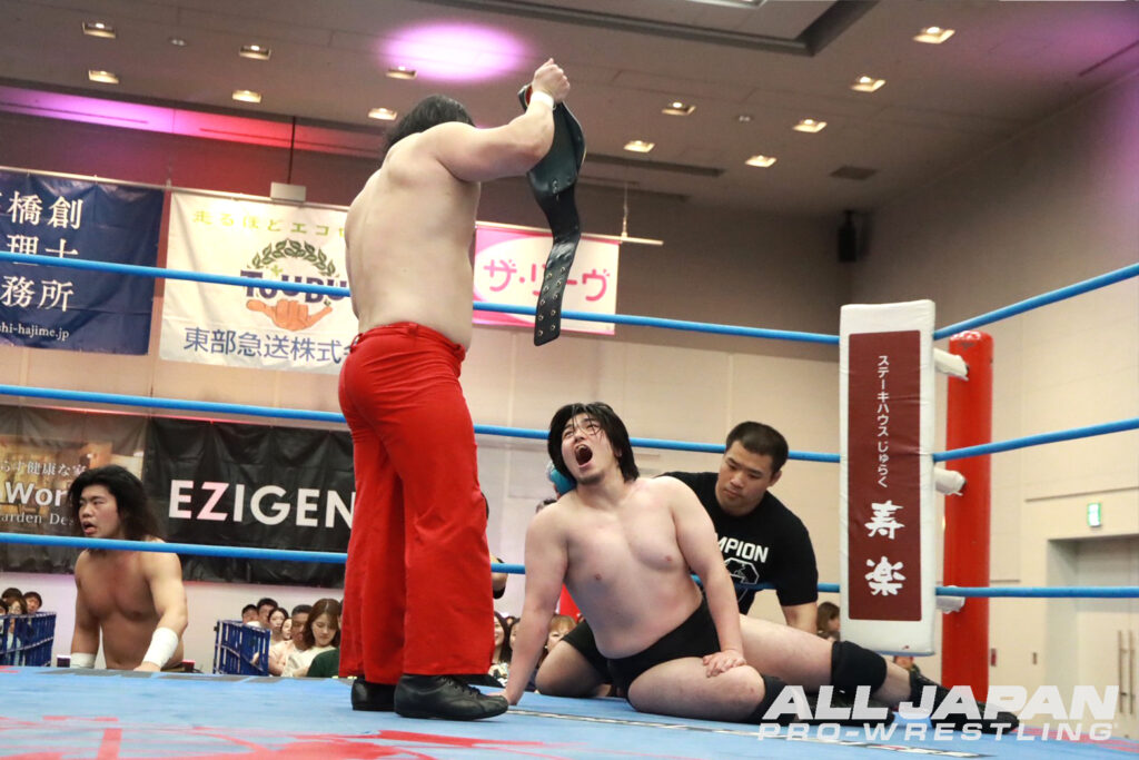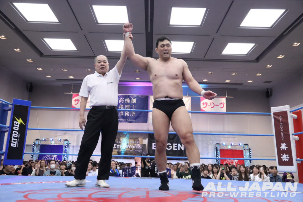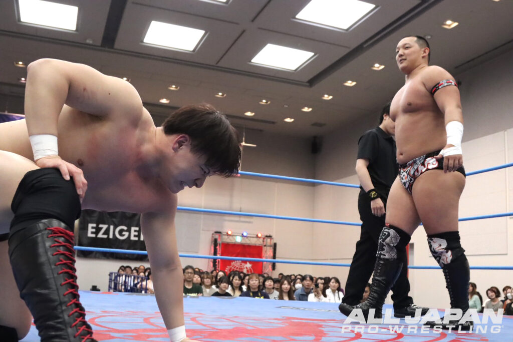 世界タッグ王者に君臨する綾部蓮は開幕戦で斉藤ジュン、4.18名古屋大会でザイオンを破り会心の2連勝。対する鈴木秀樹は、開幕戦でザイオン、2戦目で関本大介に敗れており、対照的な星取り状況だ。注目のシングル初対決は、綾部が頭を撫でようとすると秀樹は強烈な張り手。綾部も張り返して会場に殺気が充満する。場外戦で優勢となった綾部はカウント9ギリギリまで痛めつけ重いエルボーを打ち付けていく。ロープ際で放ったビッグブーツをかわされると、秀樹がボディへのエルボー。綾部もランニング・ネックブリーカードロップ、串刺しフロントハイキックを決めたが、秀樹はドラゴン・スープレックスを丸め込んでドロップキックの連射から腹部を蹴り上げる。綾部がフルネルソンバスターで叩きつけデスルーレットの体制。切り返した秀樹はスリーパーで絡みつく。スタミナを奪ってダブルアーム・スープレックスを狙ったが、綾部が耐え抜きエルボー合戦。デスルーレットを決めさせない秀樹が、ボディをエルボーで打ち抜くとヨーロピアンクラッチでカウント3つ。職人技で大巨人の進撃を止め、3戦目で初日を出した。