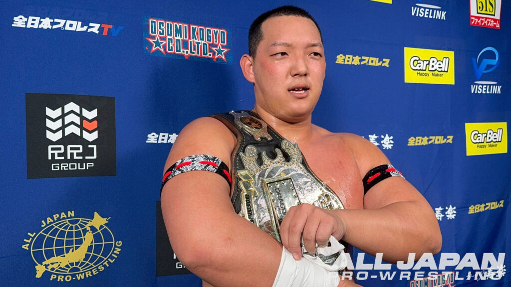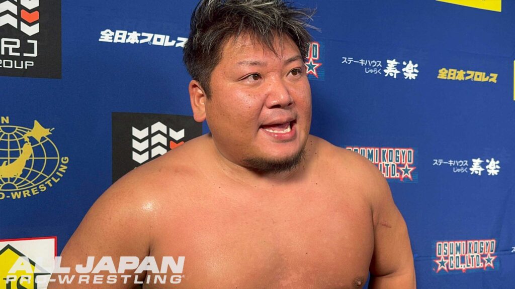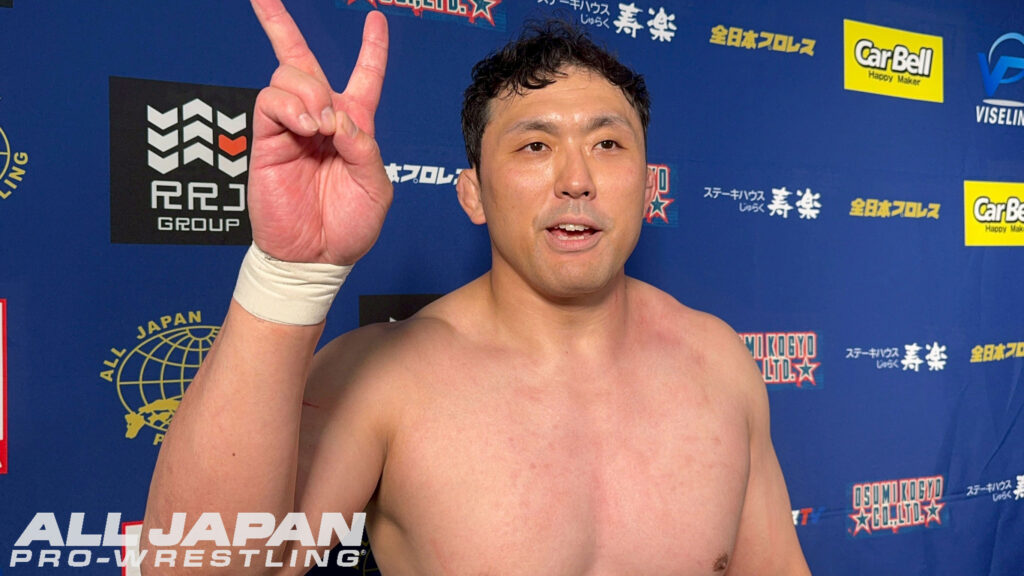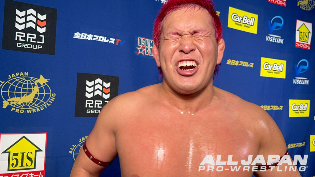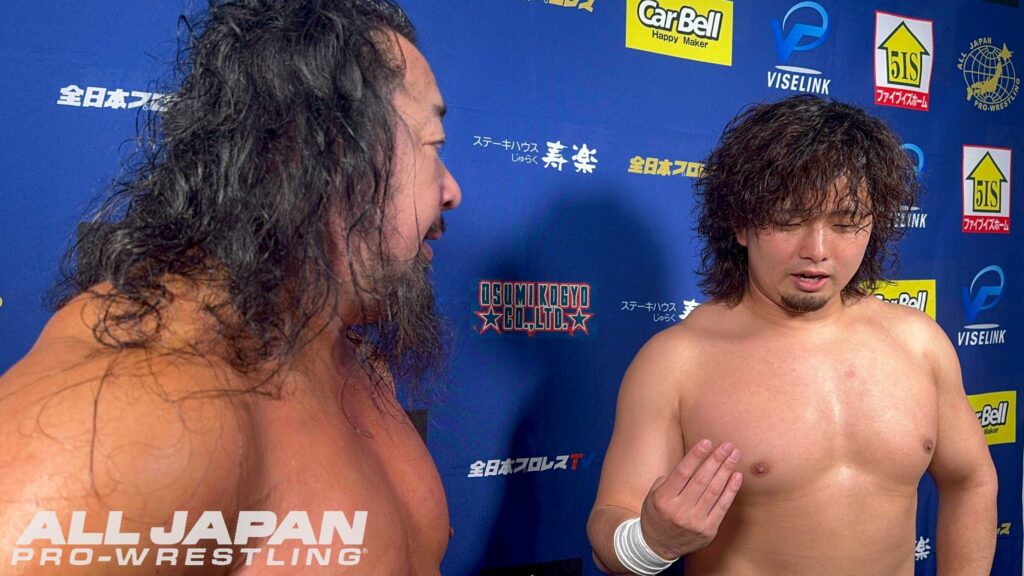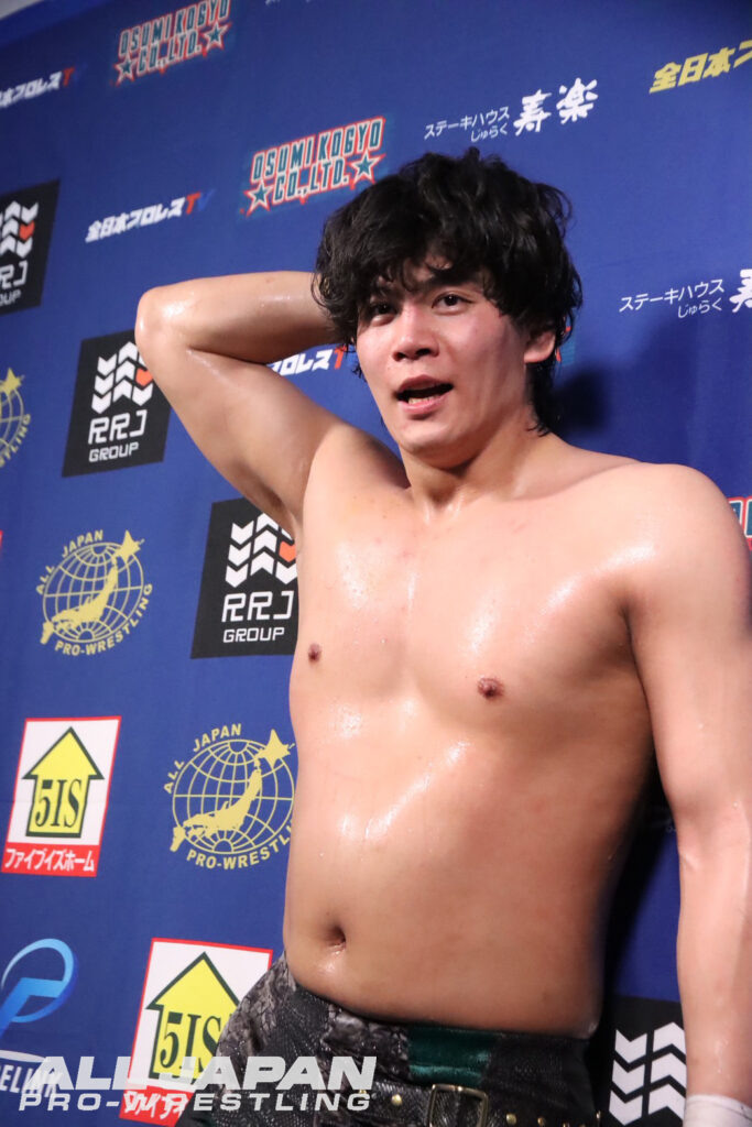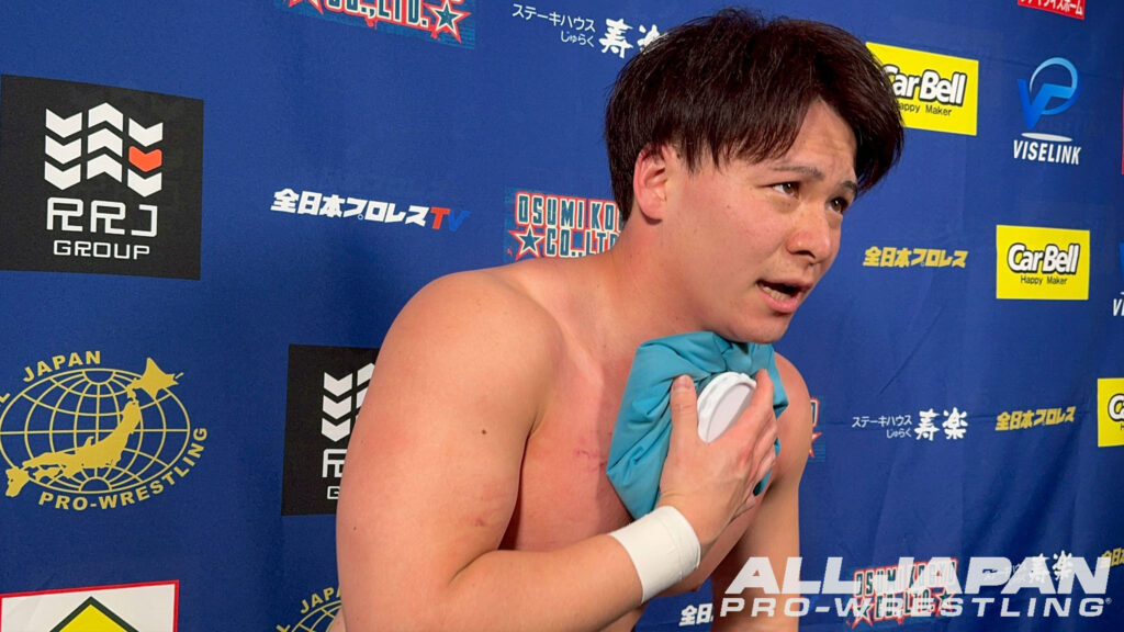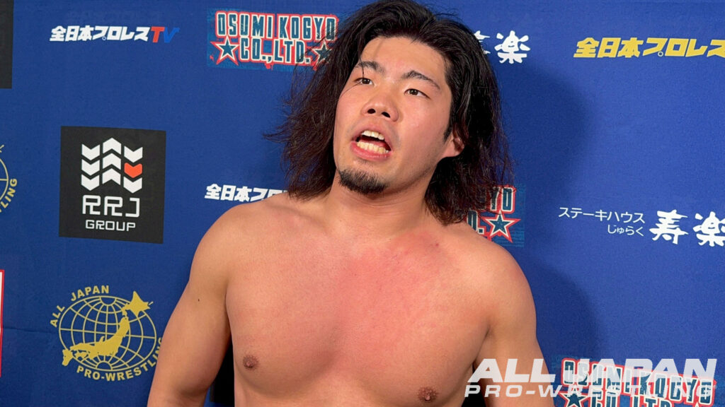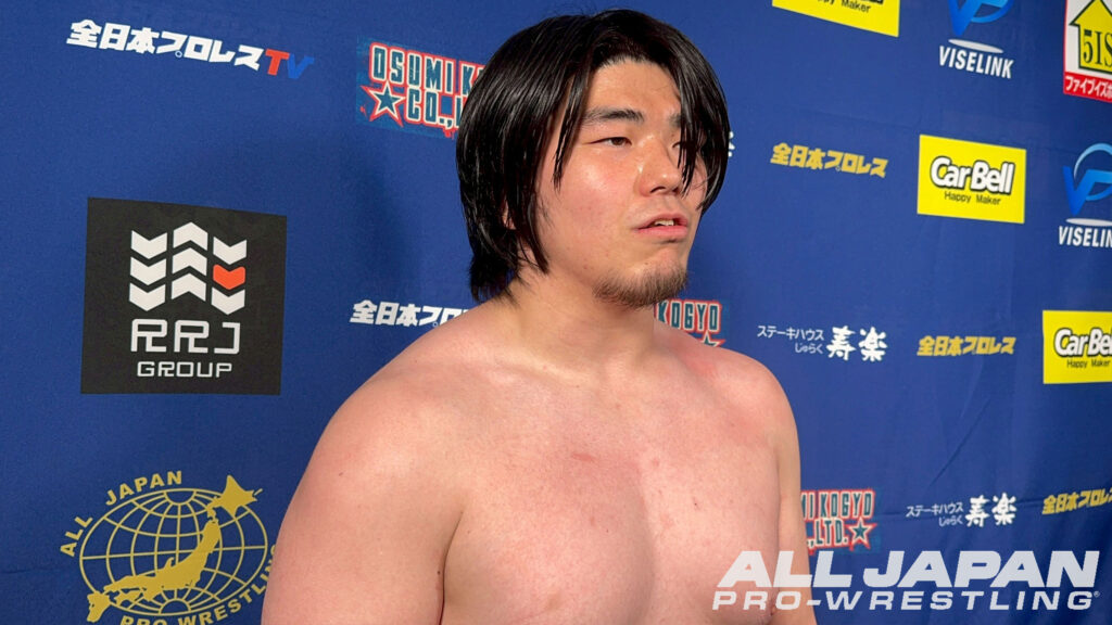 羆嵐「クソー…2連敗か。チクショー…、一撃一撃が違いすぎるな。クソ…、ハンパじゃない…、でもアルゼンチンで担いだよね?やってできないことはない。相手が200kgあろうが300kgあろうが俺は持ち上げて投げるよ。クソ…、悔しいな。オデッセイ、俺は勝手に新たなライバルだと思ってる。向こうはどう思ってるか知らねぇけど。これだから全日本プロレスは面白ぇな。2連敗したけどよ、ここから巻き返せばブロック上がれるだろ?今年は結果を求めてんだよ。残り全員、5人か?6人か?全員なぎ倒してやるからな!ハー!」