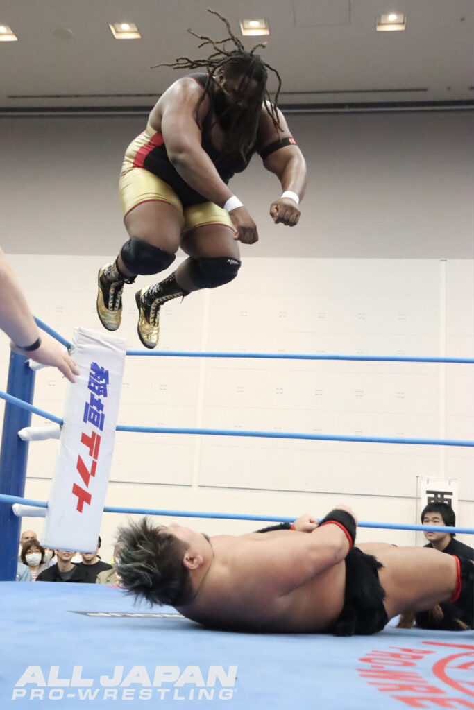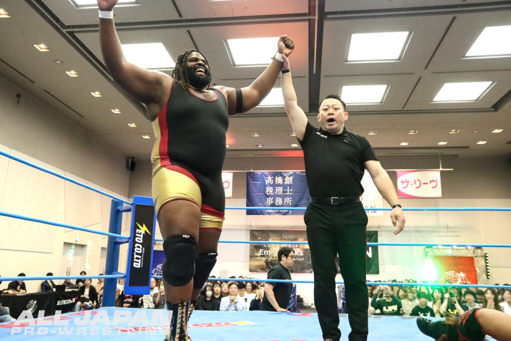 GAORA TV王者の羆嵐は開幕戦(4.12後楽園大会)で前年覇者・斉藤レイに敗れて黒星スタート。初出場のオデッセイは4.18名古屋大会でレイをダイビング・ボディプレスで沈めて初戦白星を飾った。日米スーパーヘビー級対決となったAブロックのシングル初対決は、のっけから迫力のあるロックアップ。重戦車のような2人がぶつかり合うと、オデッセイが意表をついたヒザ蹴り。羆嵐もドロップキックで応戦してエプロンから場外のオデッセイ目掛けクロスボディ。184kgをボディスラムで叩きつけセントーンを投下すると、串刺しラリアット、セカンドロープからのセントーンと畳みかける。2度目のトライでアルゼンチン・バックブリーカーを決めてバックフリップ。カウント2.8で返したオデッセイは、Journey’s Endで試合をひっくり返すや、一気にダイビング・ボディプレス。GAORA TV王者を飲み込んで2戦2勝となった。