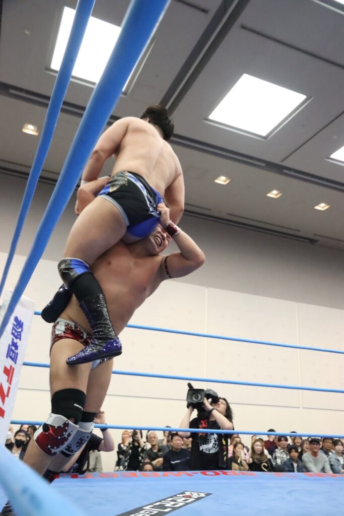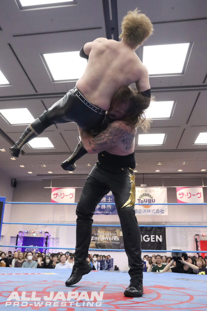 26歳3カ月での最年少優勝記録更新を宣言した本田竜輝と2022年に26歳6カ月で最年少優勝を飾った青柳優馬のBブロック公式戦。本田は初戦となった4.18名古屋大会でDRAGONGATE・菊田円に敗北。サイラスの欠場でスクランブル出場となった優馬は開幕戦で関本大介に敗れたものの、2戦目は斉藤ジュンに勝利して、1勝1敗という状況。過去のシングルで5勝2敗と優馬を圧倒している本田は、反則カウント1・2・3・4!で先手。反撃を狙う優馬を場外に落として鉄柱やエプロンに顔面を叩きつけていく。DDTで悪い流れを断ち切った優馬はリングに戻るとパイルドライバー。串刺しジャンピングエルボー、ブーメランクロスボディ、ダイビング・ボディアタックからフロントネックロックで絡みついた。エンドゲームに移行される前にエスケープした本田はカウンターのスピア。激しい消耗戦となり、優馬がバリエーション豊かな丸め込み。ロープを駆け上げってのスイングDDTからコーナー最上段。追いついた本田は雪崩式ブレーンバスターを決めてエクスプロイダー。優馬のラリアット、スピンキック、ロックスターバスターという波状攻撃を執念のクリア。ラリアット2連発でねじ伏せると、勝利の方程式・ファイナルベントが大爆発。紙一重の攻防を持ち前の爆発力で制して勝ち点2を掴み取った。