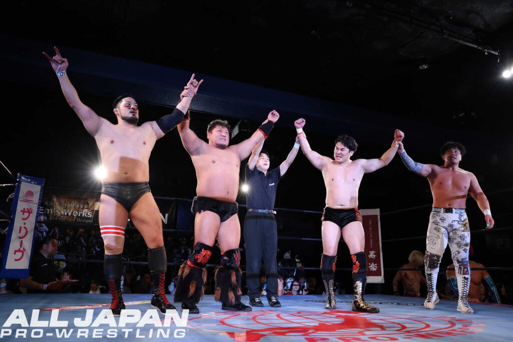 青木は先発を買って出て、HAYATOと対峙。青木はヘッドロックを決め、フロントキックでなぎ倒して、MUSASHIにタッチ。MUSASHIもHAYATOに逆水平チョップ、低空ドロップキックと攻め立てる。しかし、アツハヤの連係のエジキとなって動きを止められると、相手チームにつかまってしまう。MUSASHIは井上に反撃し、羆嵐にスイッチ。羆嵐は怪力で相手チームを蹴散らす。井上にセントーンを放った羆嵐は青木にタッチ。両チームが入り乱れる展開となった中、リング上は青木と井上の1対1。青木はスワンダイブ式ミサイルキックからケサ斬りチョップを狙うも、これは阻止される。井上の蹴りで反撃を受けた青木だが、カウンターのラリアットから走り込んでのケサ斬りチョップを見舞い3カウントを奪った。
