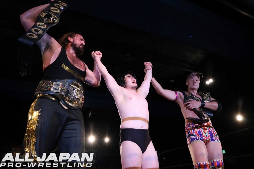 綾部「今日はタイタンズ・オブ・カラミティ、綾部蓮&タロース、公式戦がなかったけど、次、春日部も綾部蓮はないが。我々の絶望っていうのも、チャンピオン・カーニバル、まだ始まったばかりだが、見せつけてやる。それだけだ」