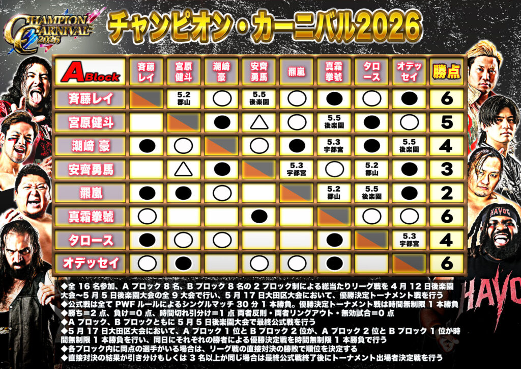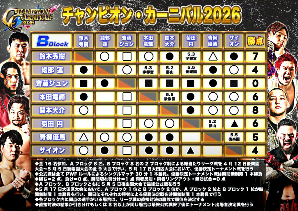 【星取表】「チャンピオン・カーニバル2026」4.26三条大会終了時点