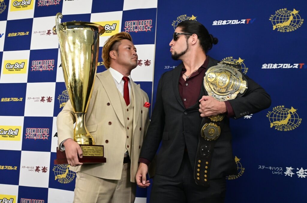 全日本プロレス秋のビッグマッチ「ジャイアントドリーム2025」9.23立川大会に向け、全日本プロレス事務所で三冠ヘビー級選手権試合の記者会見が行われた。会見には「第12回 王道トーナメント」を制し、3年ぶり3度目のトーナメント優勝を果たした宮原健斗、防衛回数7を数え盤石の王者ぶりを発揮する斉藤ジュンが出席。秋のビッグマッチのメインイベントを飾る三冠戦へ向け意気込みを語った。
