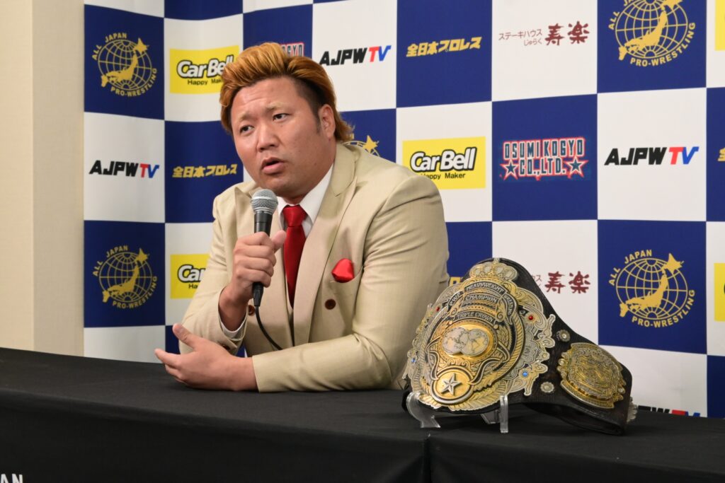 宮原「この9月23日の一つの僕の中のテーマとして、昔、全日本プロレスを、そして昔プロレスを見てたファンの方や、最近見出したファンの方がプロレスを見て元気をもらったり、ワクワクしたり、興奮したり、そういう感情をファンの皆さんも一緒に、リング上で戦うプロレスラーと一緒にそういう感情をぶちまけるような空間を僕は9月23日、秋の夢空間を作りたいと思ってるんで。それはやっぱりプロレスラーだけじゃなく、ファンの皆さんの力もプロレスにとって大事で。この日は最高峰の戦いなんで、久しぶりにプロレスを観る方たちや、僕のベルト姿を観たことない最近のファンも、ワクワクドキドキ、明るく楽しく激しいプロレスを堪能してほしいなというのが僕のこの日のもう一つのテーマなんで。それをリング上で体現して、宮原健斗を思う存分見せてやろうかなと思っております。その中で三冠ベルトを絶対巻くという気持ちです」