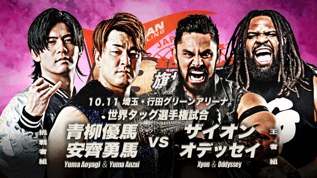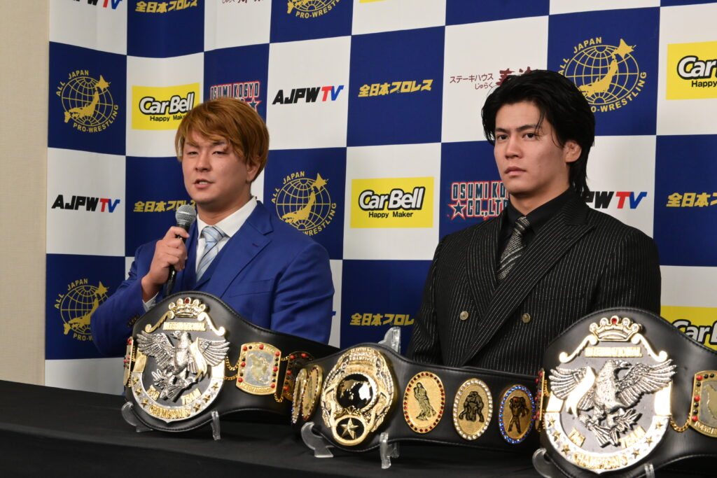 「旗揚げ記念シリーズ2025」10.11行田大会で行われる世界タッグ選手権試合に向け記者会見が行われ、王者組のザイオン&オデッセイ、挑戦者組の青柳優馬&安齊勇馬が出席した。鈴木秀樹&真霜拳號から一発で王座を奪取したザイオン&オデッセイはタッグチームとしての絆に自信。9.23立川大会で安齊へタッグ結成を持ち掛け実現した青柳優馬・安齊勇馬組は始動後いきなりの世界タッグ王座挑戦となる。今回のタッグ結成に青柳は「プロレス界に轟く新たなタッグチームが誕生する予感」安齊はプロレスの師匠である青柳とのタッグに「息が合わないわけない」と新コンビの躍進に向け世界タッグ獲りを誓った。