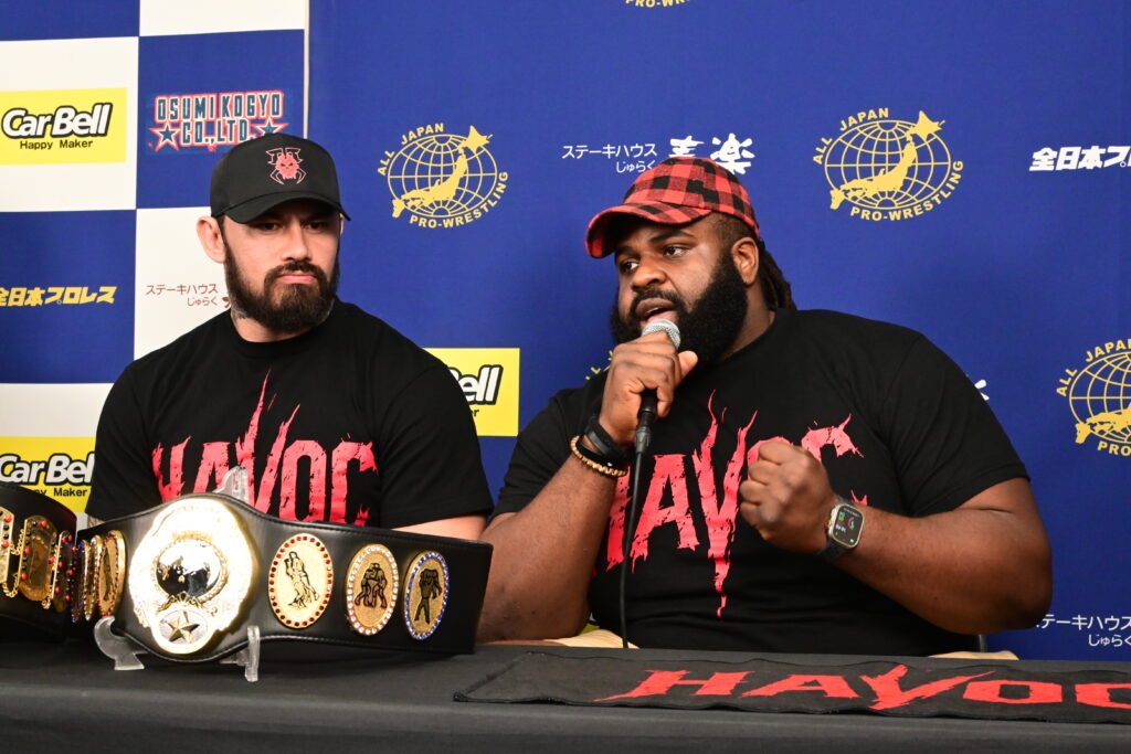ザイオン「このタイトルを取って、ここからが出発点だと思ってる。これからジェットコースターがどんどんどんどん上に上がって、これから突っ走るような。(世界タッグは)素晴らしいタイトルで、ベルトもかっこいい。初防衛戦ものっけから、非常に強い選手と当たるけど、このタイトルはどうしても手放したくない。ただ1つだけ言っておくとHAVOCは暴れるのも戦うのも大好きだ。だから、このベルトを落とさないように大暴れしてやる」