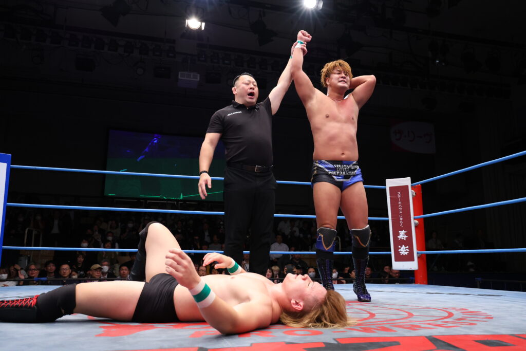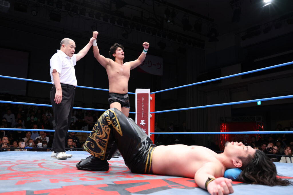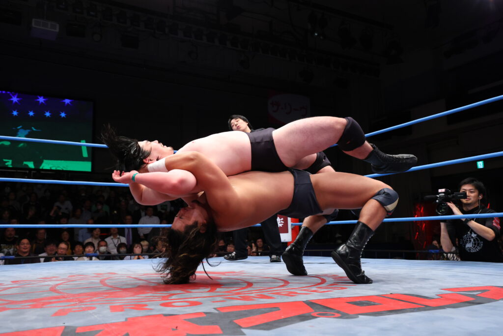 潮﨑は右腕のサポーターを外して、豪腕ラリアット狙い。しかし、宮原はカウンターのブラックアウトから素早くシャットダウン・スープレックスの体勢。潮﨑は踏ん張り、ローリング式ケサ斬りチョップを放つが、宮原もカウンターでブラックアウトを返す。そして再度、ショットダウン・スープレックスの体勢に入り、粘る潮﨑をマットに叩きつけて3カウントを奪った。