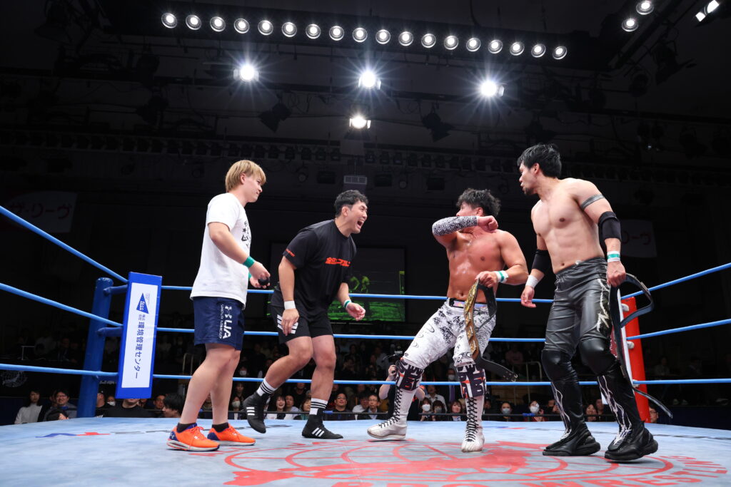 熱戦の末に防衛に成功した王者組の前に、小藤が現れて挑戦表明。MUSASHIからパートナーを問われた小藤が「ボクのパートナーはこの人です」とアピールすると、テーマ曲とともに鈴木秀樹が登場。まさかのヘビー級のパートナーの登場に驚く王者組に対して、秀樹は「シャアー!」と猫のような威嚇を見せてたじろがせる。さらに小藤が秀樹とのチーム名を「アグレッシブキャッツ」と唐突に発表し、異色コンビでの次期挑戦が決定的となった、