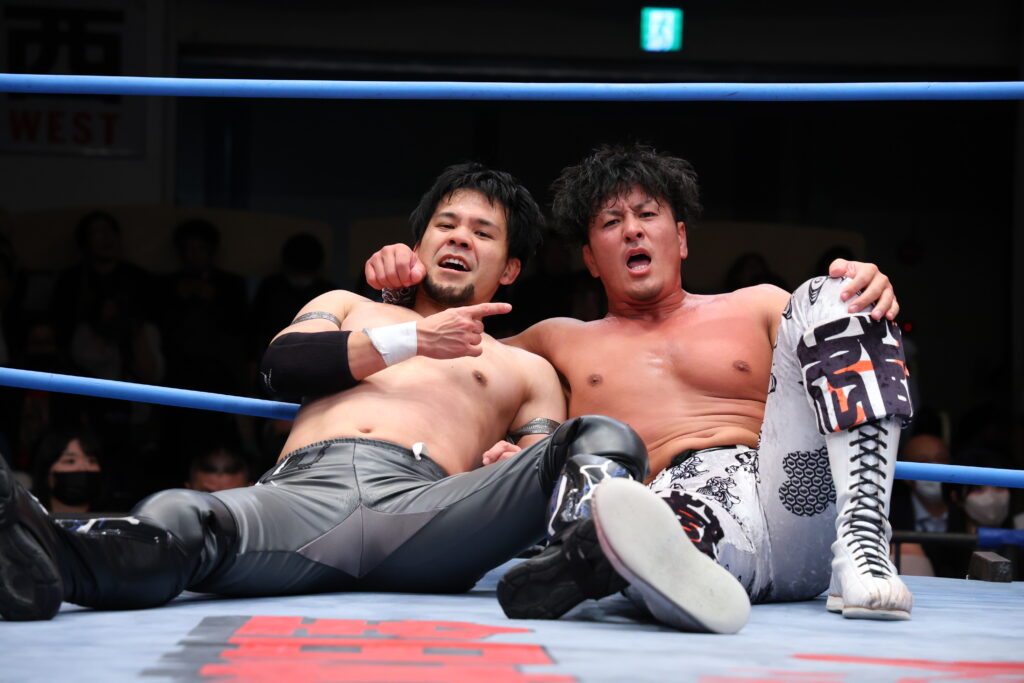 MUSASHIはヒザへのドロップキックでHAYATOの動きを止めて、吉岡との連続攻撃で追い込んでいく。HAYATOもカウンターのドロップキックからスイングDDT。4選手が入り乱れた中、挑戦者組がMUSASHIにトレイン攻撃、そして合体攻撃を畳みかける。追い込まれたMUSASHIは吉岡とのサンドイッチキックで形勢逆転。吉岡の雪崩式フランケンシュタイナーからエストレージャフトゥーロ。二天一流狙いはHAYATOが切り返し、亮生との合体技。シド・ヴィシャスはMUSASHIがかわし、HAYATOにエクスプロイダー、ファルコンアロー。HAYATOのひとでなしドライバーもしのぎ、トラースキックから後頭部を蹴りつけ、エストレージャフトゥーロを2連発もカウント2。ならばと二天一流で叩きつけて、粘るHAYATOを振り切った。