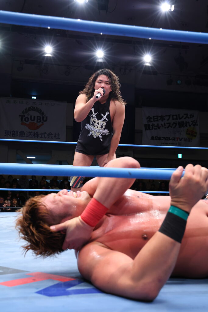 場内の声援を背に懸命のファイトを見せた小藤に対して優馬は、あくまでも個人の意見として「全日本プロレスに来たらどうだ?」と全日本プロレス入りのススメ。具体的に入団うんぬんとなると団体間の話し合いも必要となるが、小藤の闘いぶりが全日本の選手、ファンの心を掴んでいるのは間違いない。
