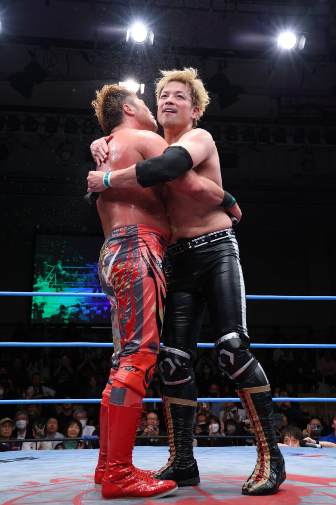 潮﨑は躊躇しながらも意を決したようにリングに上がり、宮原と対峙。宮原から「潮﨑豪の全開ファイトを見たいファンもいるだろう。今日はハグしようぜ」と呼びかけられた潮﨑は、みずから王者に歩み寄って抱擁。試合前からのブーイングは消え、大きな拍手と「シオザキ」コールの中をHAVOCのメンバーとともに引き揚げた。