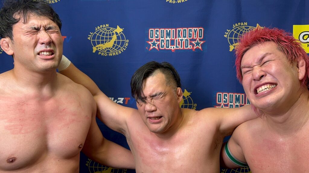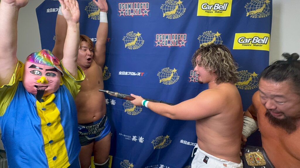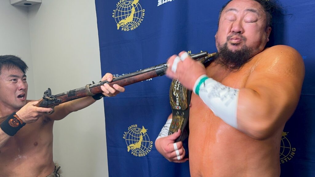 第11代全日本プロレスTV認定6人タッグ王者の大森北斗&羆嵐&他花師は、5.18大田区大会で王座返り咲きを果たし、これが6度目の防衛戦。5月のタイトルマッチで北斗のナルシストプレスに沈んだ青柳優馬は、菊タロー、そして群馬県甘楽町でキウイフルーツ農家、養蜂、養鶏を営むFUMAと合体した。