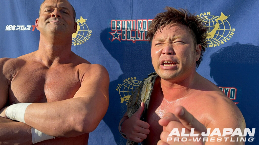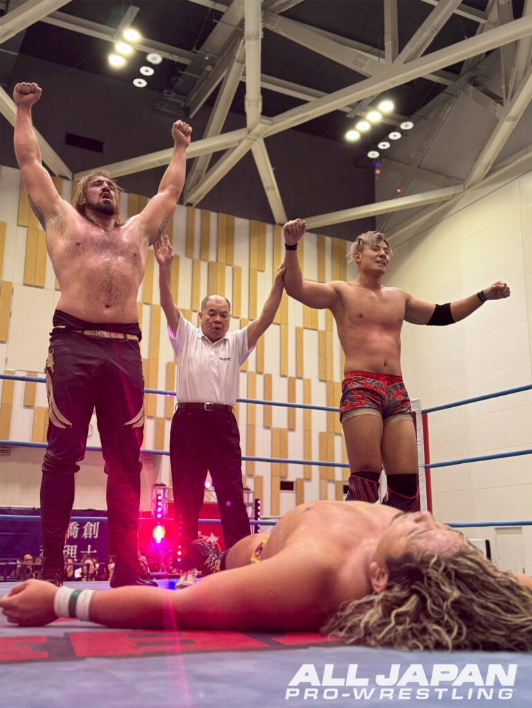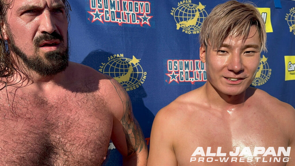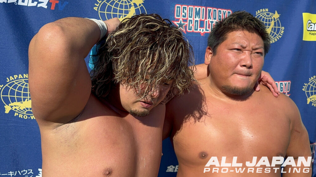 亮生「これが全日本プロレスのヘビー級か…キツイ…、もう一発でくらくら。でもさ、ひとつ気づいたことがあるんだよ。俺たちのシド&ナンシー、ザイオン避けたよな。これがどういうことなのか。あれ喰らったらやべぇって、あのザイオンたちですら思ったんだよ。この技が当たりさえすれば、ザイオンとオデッセイの2人を倒せる可能性があるってことだろ。そこに持っていくまでをしっかり研究して。まぁ今日の負けはしょうがない。あとは全部勝って優勝してあいつらのベルトに俺たちが辿り着くぞ」