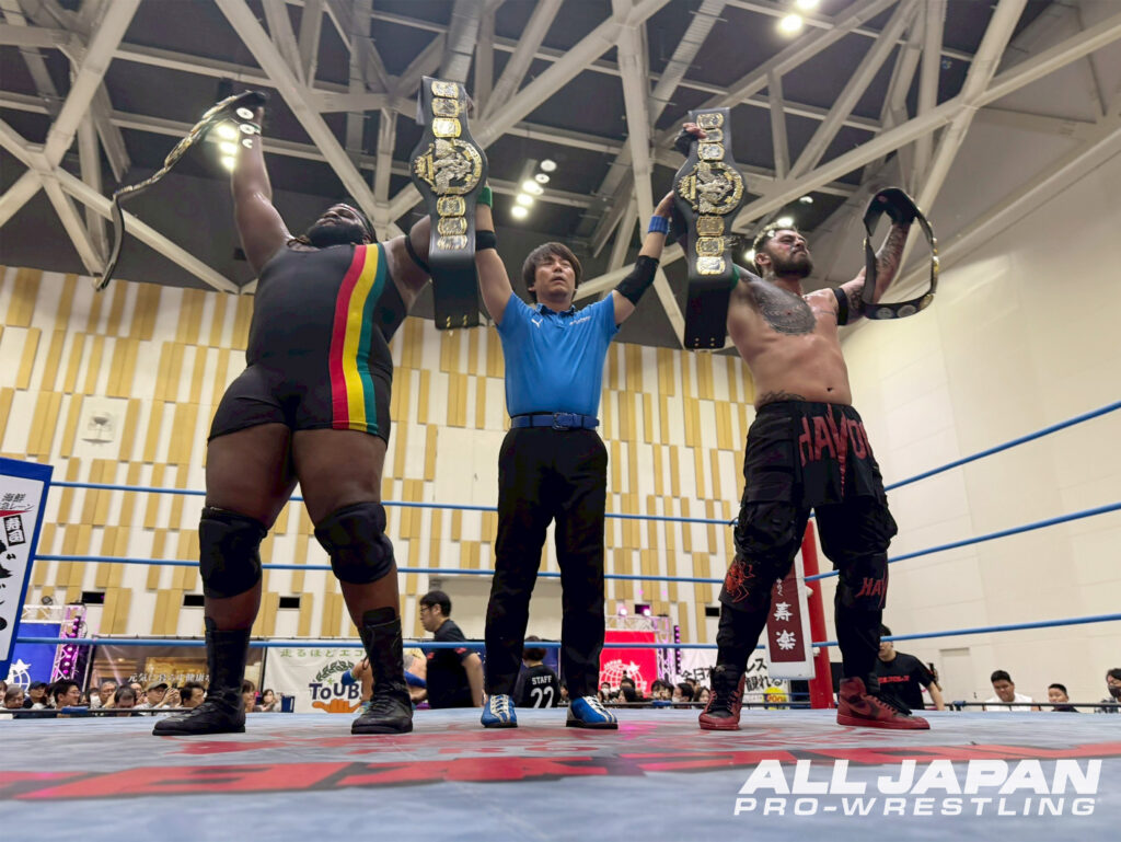 世界タッグ王者に君臨するザイオン&オデッセイは、開幕戦で他花師&黒潮TOKYOジャパンのくせ者コンビを突破。ゼンニチジュニアの誇りを胸にエントリーした青柳亮生&ライジングHAYATOは、優勝候補の一角である青柳優馬&安齊勇馬から会心の勝利を収め、2日連続の大物狩りを狙う。身長193cm・体重184kgのスーパーヘビー級戦士・オデッセイは、世界ジュニア王者である亮生を子ども扱い。亮生とHAYATOが2人掛かりで襲い掛かっても肉厚ボディで返り討ちに。腰をくねらせご機嫌な表情を見せた。アツハヤの場外ダイブもザイオンとオデッセイが同時に受け止めてサンドイッチ。鉄柵に叩きつけていき試合を優位に組み立てる。HAYATOがオデッセイの串刺しアタックを回避すると亮生が低空ドロップキック。巨体を崩すとスリーパーホールドでスタミナを奪っていく。オデッセイがコーナーで押し潰して脱出すると、ザイオンがワイルドな連続攻撃からキャメルクラッチ。ローンバトルを強いられた亮生は、突進を止めてミサイルキック。アツハヤが連続串刺し攻撃で巻き返すと、亮生の延髄斬りからHAYATOがコードブレイカー。世界タッグチャンピオンチームも負けじとコンビネーション。オデッセイがHAYATOを捕まえると、ネックブリーカーとバックドロップの融合技を敢行した。ザイオンのダイブをかわしたHAYATOが丸め込み。亮生の旋風脚からスクールボーイ、トラースキックからのジャックナイフ固めもカウント2止まり。ツープラトン雪崩式ブレーンバスターからボディプレスを誤爆させると、連続プランチャでオデッセイを足止め。ザイオンに同時ミサイルキックを発射して、スイング式バックドロップでチャンスを手繰り寄せた。そのまま一気に捨て身の合体殺法・シド&ナンシーを放ったが痛恨の自爆。オデッセイがアツハヤに襲い掛かり、まとめてフェイスバスター。抵抗するHAYATOはオデッセイにヘッドシザース。ザイオンには飛びついての十字架固めも決着とはならない。息を吹き返したザイオンがラリアットでHAYATOを一回転させると、オデッセイのジャーニーズエンドが大爆発。そして、ザイオンがダイビング・ヘッドバットで急降下する必勝パターンでHAYATOを料理。奮闘したアツハヤをねじ伏せての2連勝でタッグリーグ制覇への進撃を続けると、「オレタチハHAVOC!」とシャウトして沼津大会を締めた。