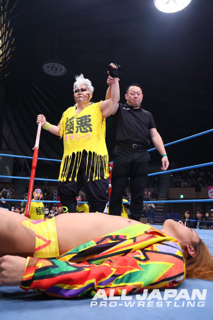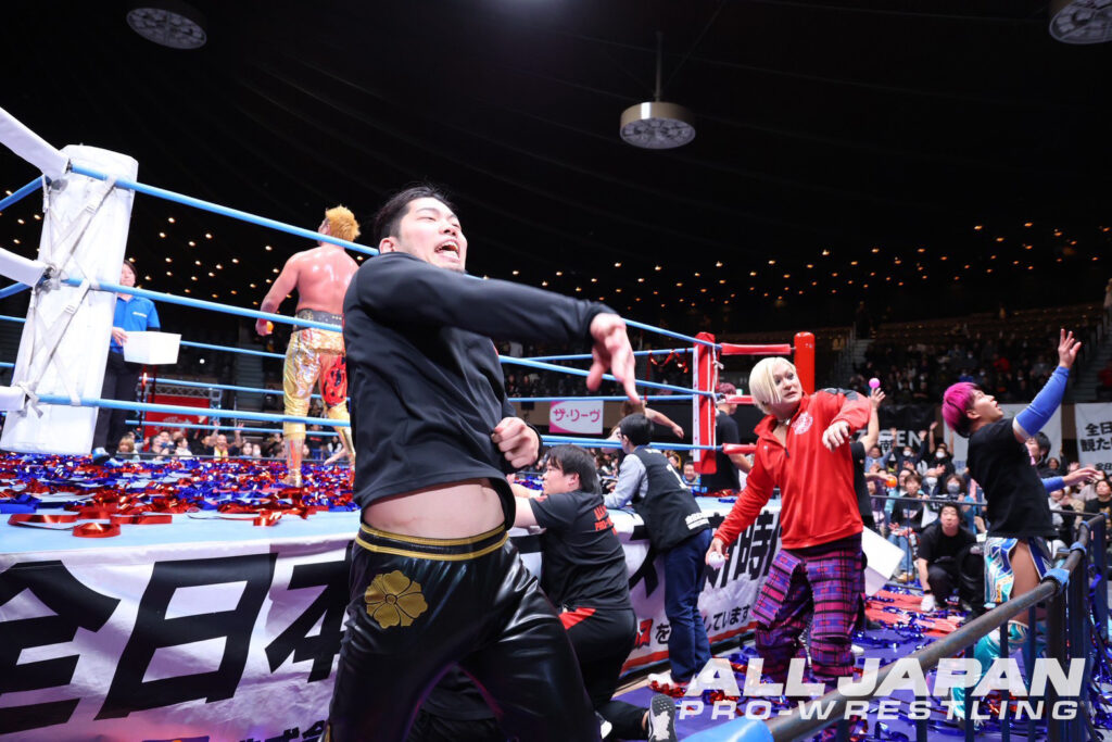 KURAMA「全日本、俺がKURAMAだ。見ての通り、パーフェクト、イージーゲームだった。来年の1.3、亮生の持つ世界ジュニア、俺が獲って、もっと面白くこの全日本プロレスをかき乱してやるよ。KURAMA、妖狐の力をお楽しみに」