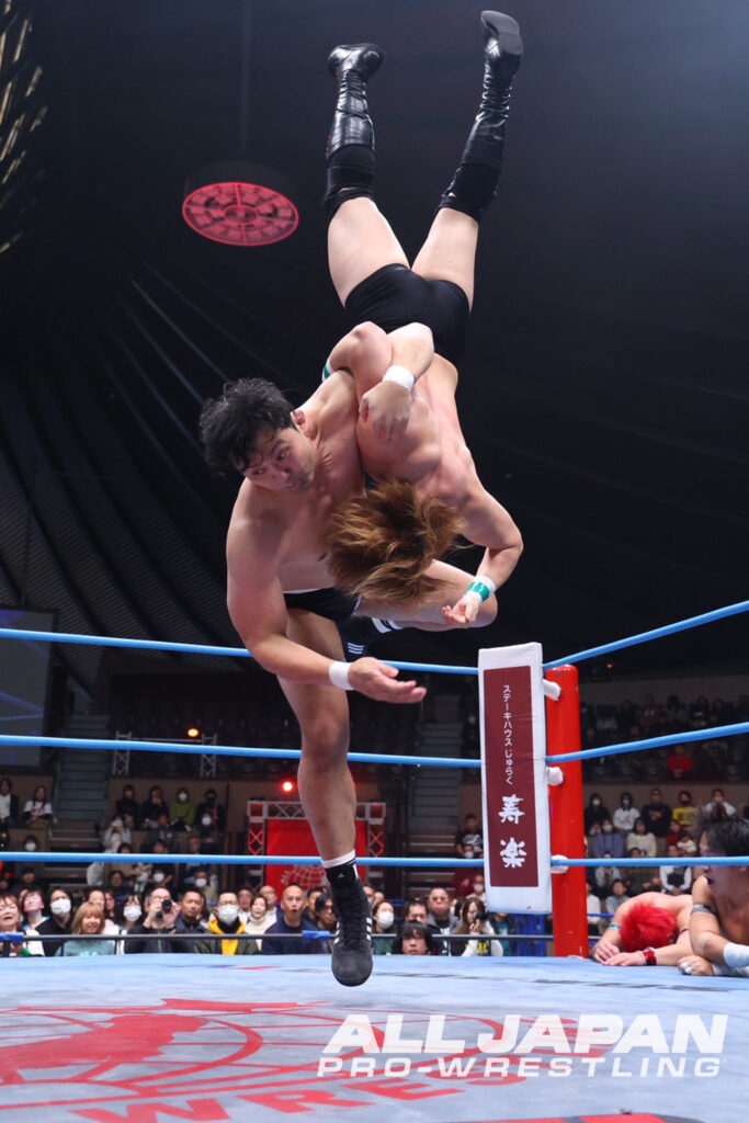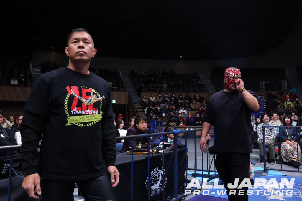 オープニングマッチは、1.3後楽園大会で世界ジュニアヘビー級王座の4度目の防衛戦を控える王者・青柳亮生が、挑戦者のKURAMAを迎え撃つ前哨戦の8人タッグマッチ。メキシコを拠点に活動するマスクマンのKURAMAは、これが全日本プロレス初参戦だ。