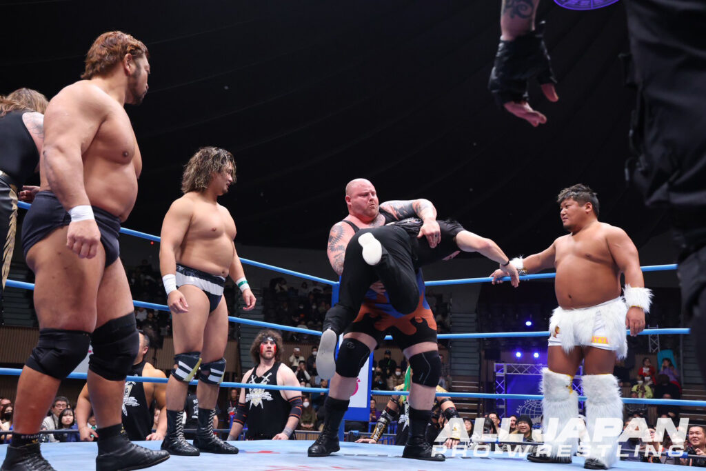 先発の芦野と関本はもう一人の羆嵐を邪魔とばかりに二人がかりで排除し、二人での攻防を繰り広げる。そこに羆嵐が戻ってきて、二人まとめてクロスボディだ。続いてはザイオン、綾部、北斗のマッチアップ。ここでもタイトルマッチに関係ない北斗はザイオンと綾部に邪魔者扱いをされてしまう。続いてはオデッセイ、タロース、サイラスの顔合わせ。怪獣大戦争に相応しい巨漢外国人3人がリング中央で激突だ。お互いに譲らずとなったところで、他の選手たちも入ってきて、一気に場外乱闘へ。ここでセコンドを連れてきていた北斗軍が総出でオデッセイを攻め立てる、一方、サイラスは相手を蹴散らしながら客席を練り歩き、再びリングへ。タロースとオデッセイも戻り、再び3人で攻防を始める。チョップとエルボーでタロースとサイラスを攻撃するオデッセイに対し、タロースとサイラスはダブルのショルダータックル。そしてサイラスはタロースにボディへの頭突きを連発して排除。オデッセイを捕まえると、そこに北斗軍がトレイン攻撃。続けてサイラスがキャノンボールだ。さらに羆嵐のダイビングセントーン、北斗のナルシストプレスが炸裂する。そこに綾部がやってきて、オデッセイにショットガンドロップキックだ。オデッセイも綾部と北斗を二人まとめてラリアット。乱戦となる中、芦野と関本のマッチアップ。芦野がエルボースマッシュを連打すれば、関本も低空のショルダータックルだ。そして関本は倒れていた北斗を捕まえてバックドロップ。そこにタロースと綾部が入ってきて合体チョークスラムを北斗にお見舞いだ。そして綾部が北斗にデスルーレットを狙う。ここはザイオンがカット。北斗はザイオンの変形のデスバレーボムを食らってしまうが、羆嵐が救出にやってくる。そして北斗と羆嵐はザイオンにコンプリートショットとフェイスクラッシャーの合体技だ。ここで乱戦となるが、ザイオンと北斗が綾部をローリングラリアットを同時に打って場外に排除。そこにタロースとサイラスが入ってきて、タロースが北斗を、サイラスがザイオンを場外に追いやる。そして残った二人で頭突きの打ち合いを展開する。そこにオデッセイが飛び込んできて、二人まとめてラリアットで場外に出してしまう。そしてザイオンと芦野もリングに戻ってきて北斗を捕獲。ツープラトン攻撃からザイオンのダイビングヘッドバットで北斗から3カウントを奪ったのだった。