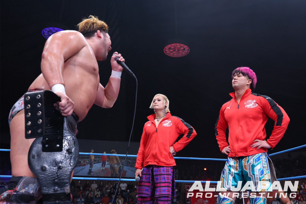 ISHIN「オイ、全日本プロレス、俺と加藤良輝withKAIがアジアタッグのベルト獲ったぞ! イエーイ! (リングにやってきた亮生とHAYATOに)どうした? 俺たちになんか用か?」